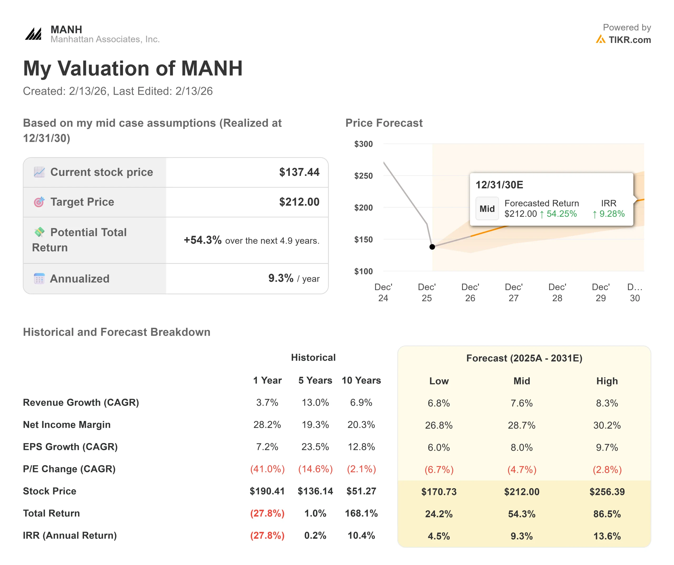 - High Case: If AI adoption accelerates and drives 8.3% revenue growth while Manhattan maintains 30.2% margins, returns could hit 87% (13.6% annually).