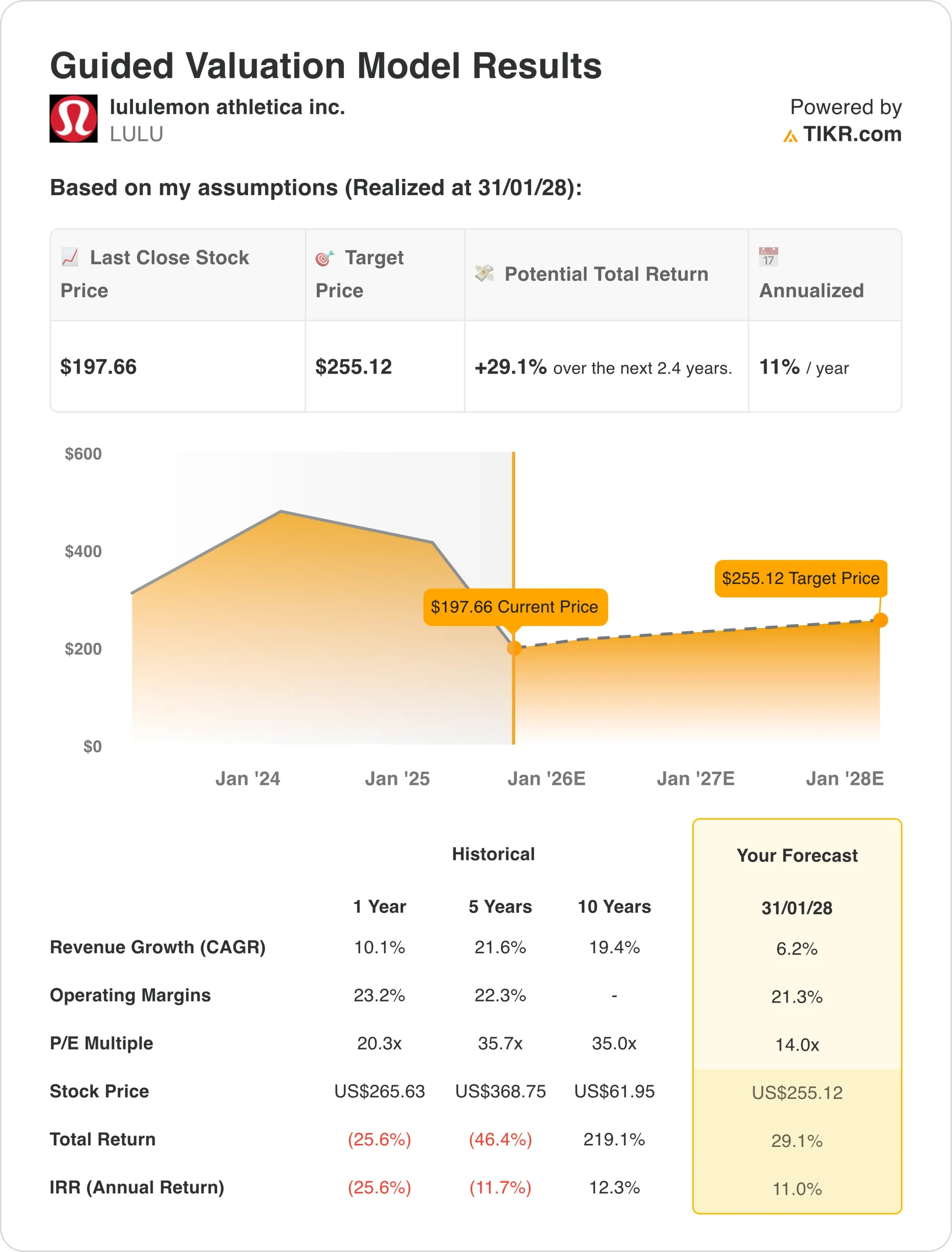 Based on estimates of 6.2% annual revenue growth, 21.3% operating margins, and a normalized P/E valuation multiple of 14.0x, the model projects LULU stock could rise from $198/share to $255/share.