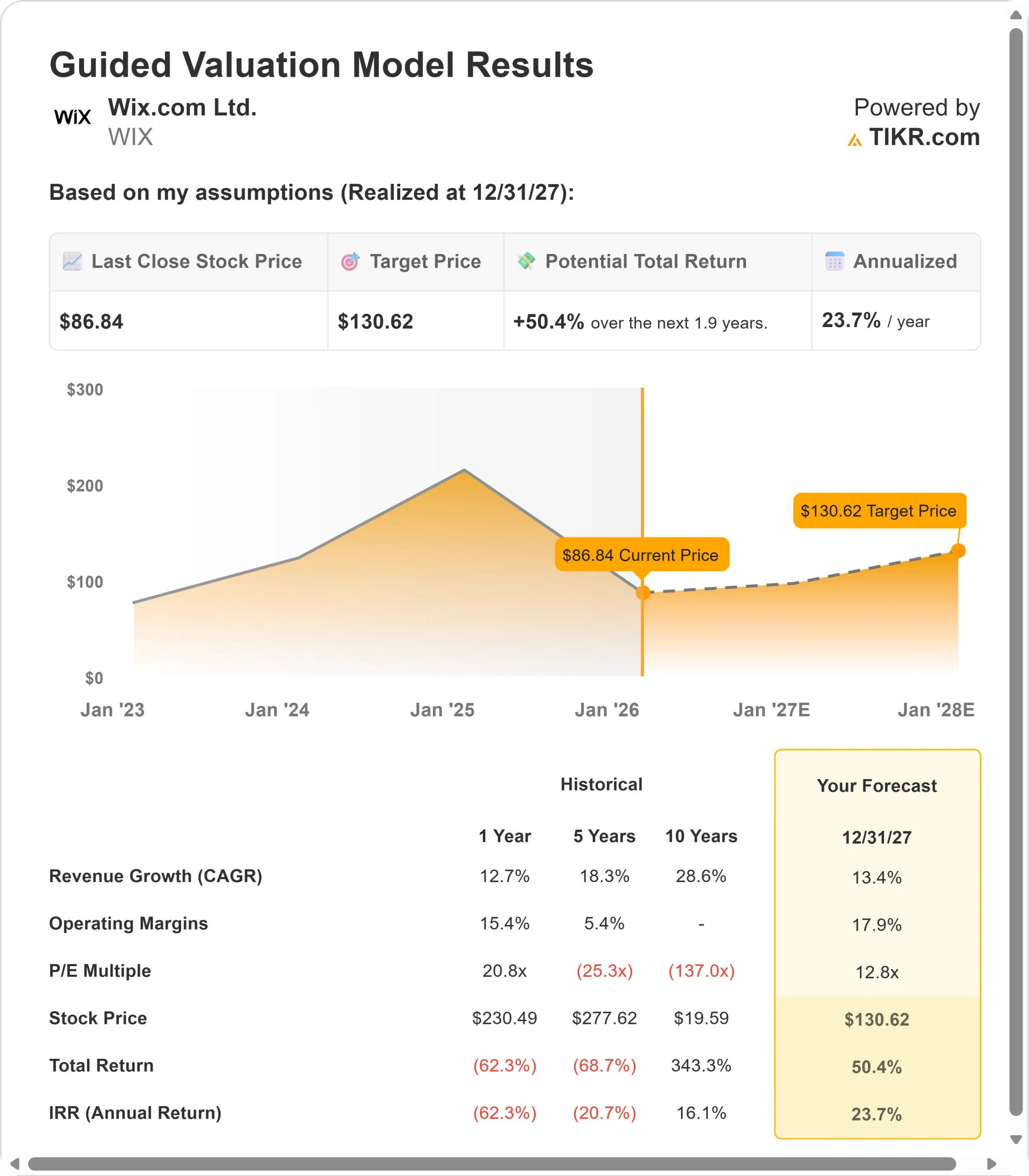 - High Case: If BASE44 adoption accelerates and Wix maintains 25.8% margins while growing at 13.1%, total returns could reach 187% (31% annually).
