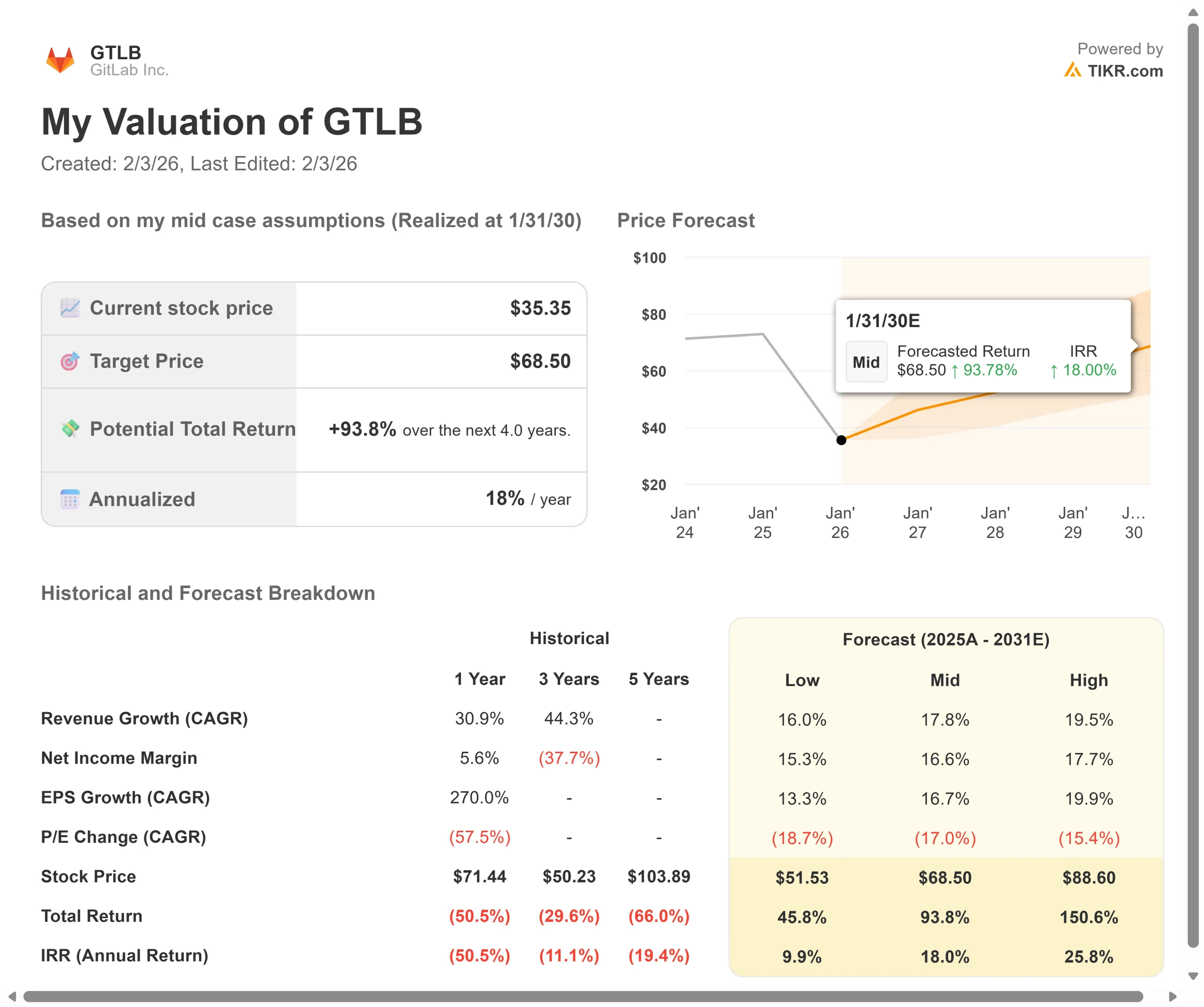 - High Case: If AI platform adoption accelerates and GitLab maintains 17.7% margins while growing at 19.5%, total returns could reach 151% (25.8% annually).