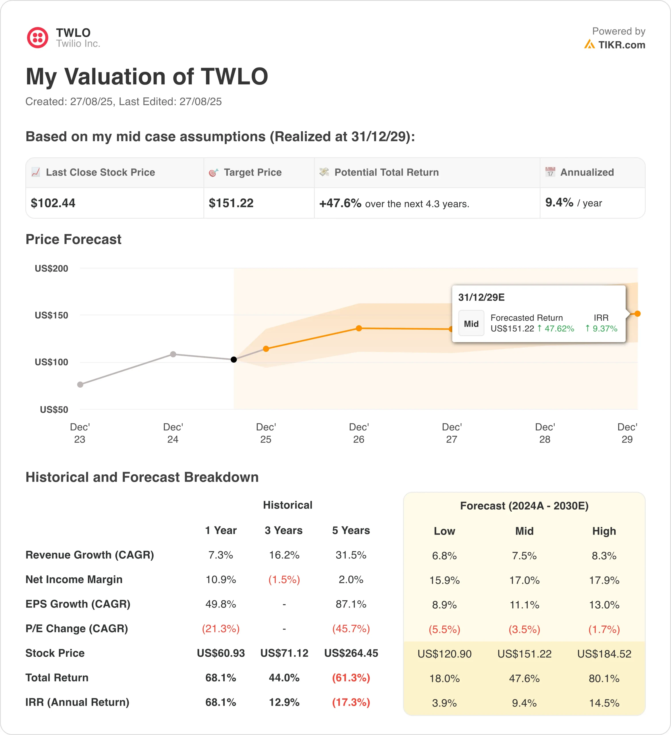 - TWLO stock could reasonably reach $135/share by the end of 2027, based on our valuation assumptions.