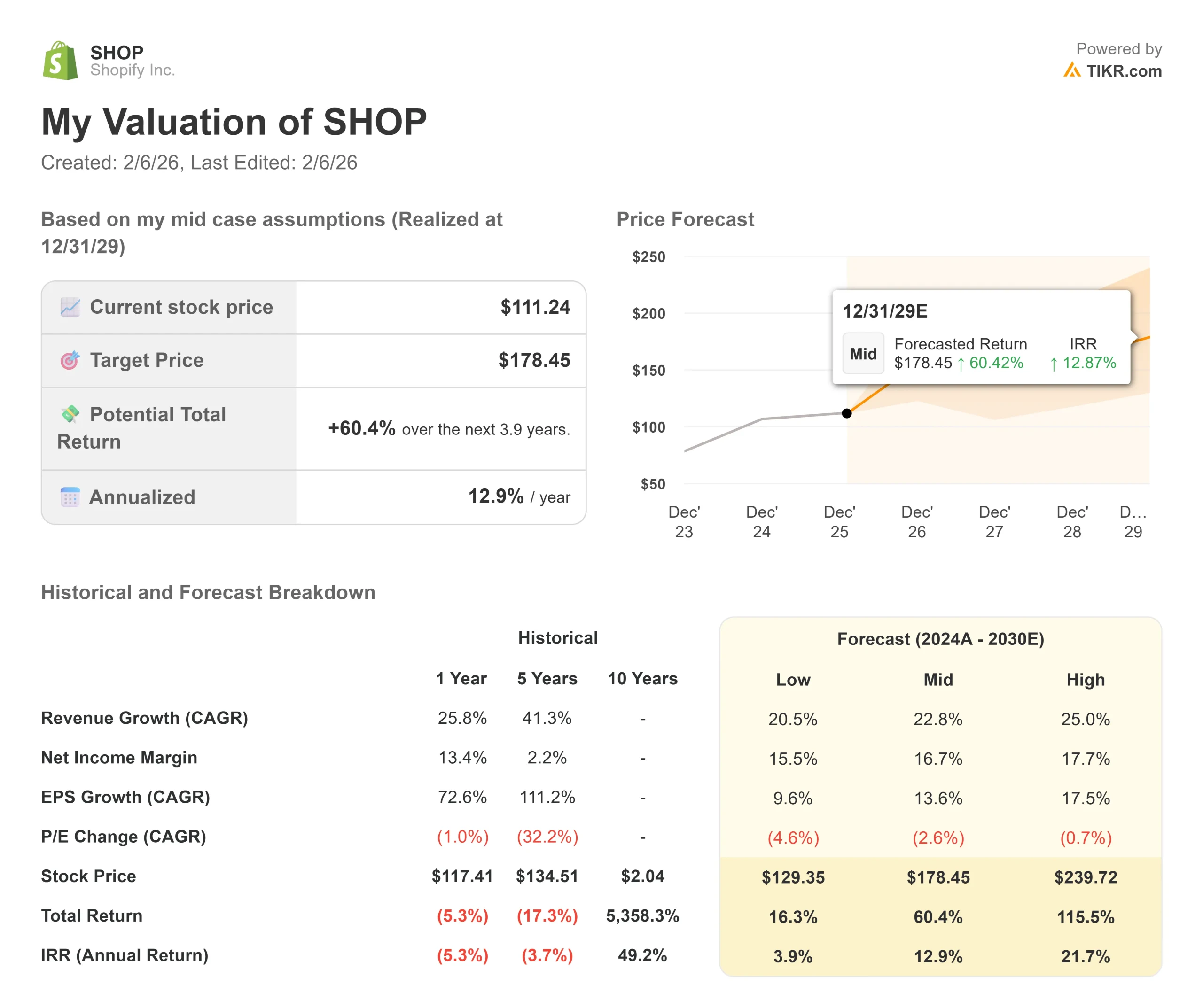 - High Case: If AI commerce accelerates and Shopify maintains 17.7% margins while growing at 25%, returns could hit 115.5% total (21.7% annually).