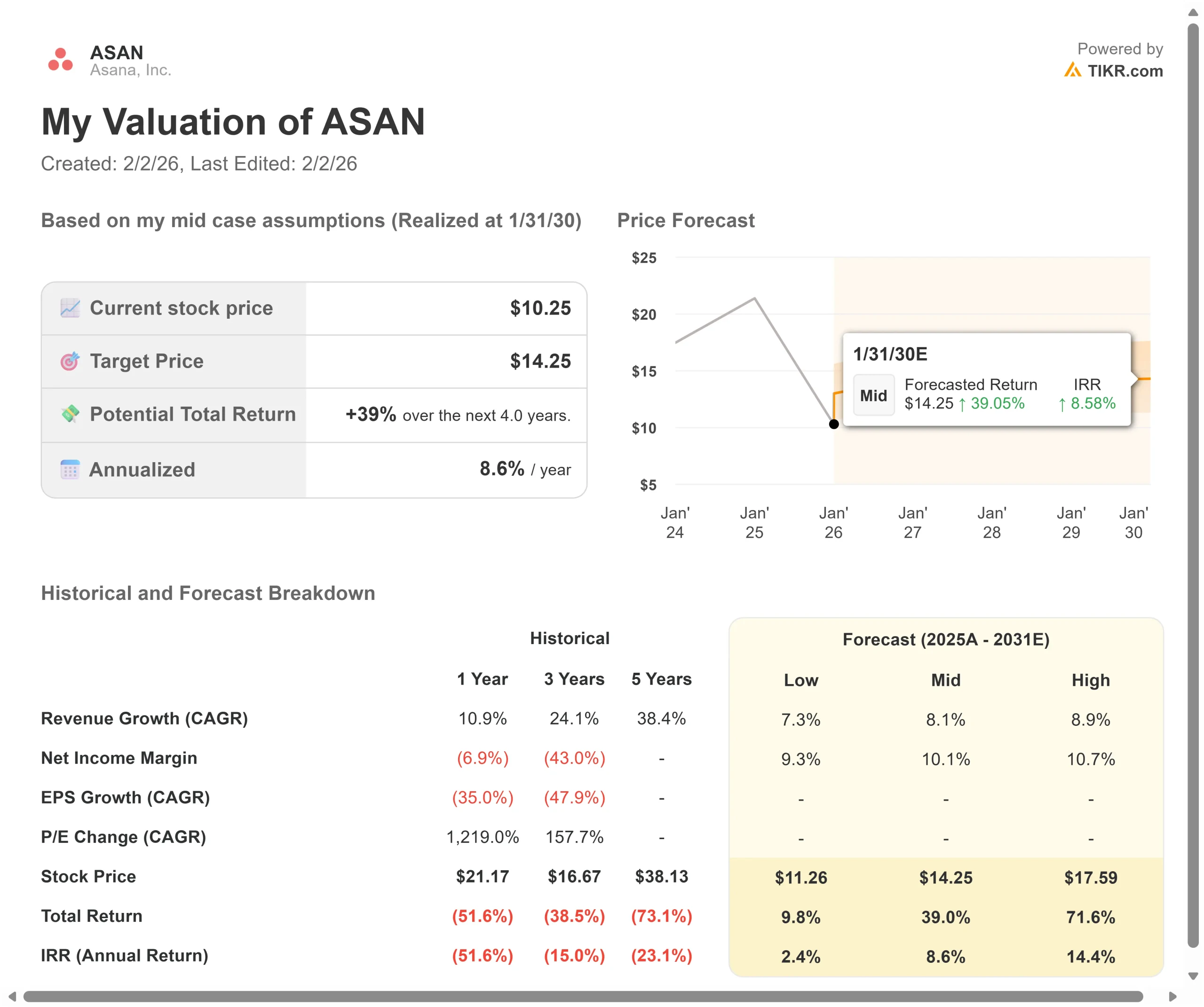 - High Case: If AI teammates accelerate adoption and Asana maintains 10.7% margins while growing at 8.9%, total returns could reach 71.6% (14.4% annually).