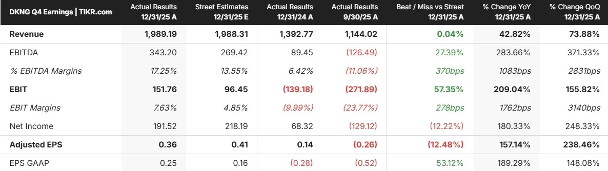 - The numbers themselves weren’t bad. In Q4 2025, DraftKings earned 25 cents per share on revenue of $1.99 billion.