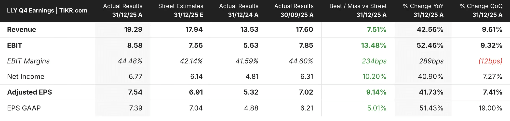 - Adjusted earnings per share came in at $7.54, topping the $6.91 expected. More importantly, Lilly guided 2026 revenue to $80-$83 billion, versus the $77.62 billion analysts had penciled in.