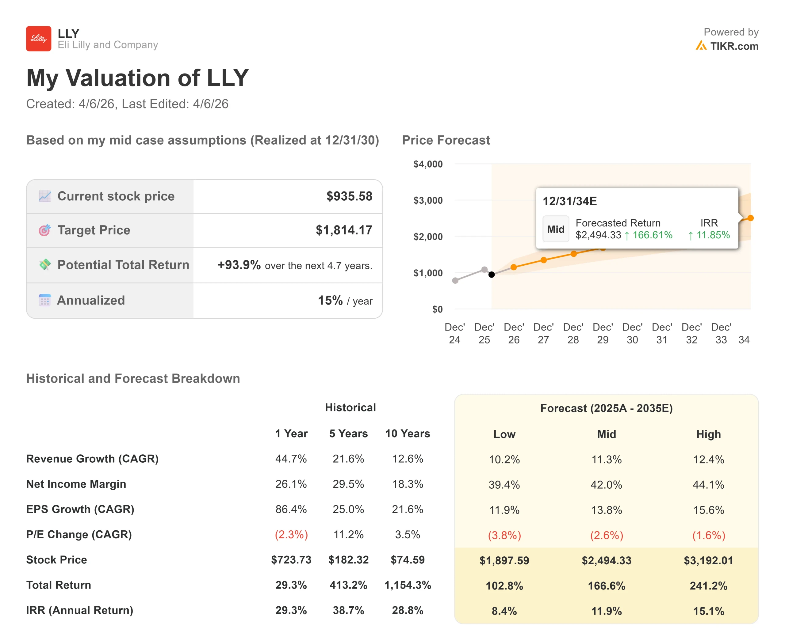 The TIKR mid-case model projects LLY at $1,814.17 by December 31, 2030, a total return of +93.9% and an annualized IRR of 15.00% per year from today’s price.