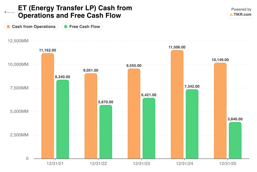 Cash flow is the key driver here. In 2025, cash from operations was $10.1 billion, but free cash flow fell to $3.8 billion as capital spending rose sharply. That decline matters because Energy Transfer is funding major expansion projects, so the market is watching whether those investments translate into higher EBITDA and distributable cash flow over time.