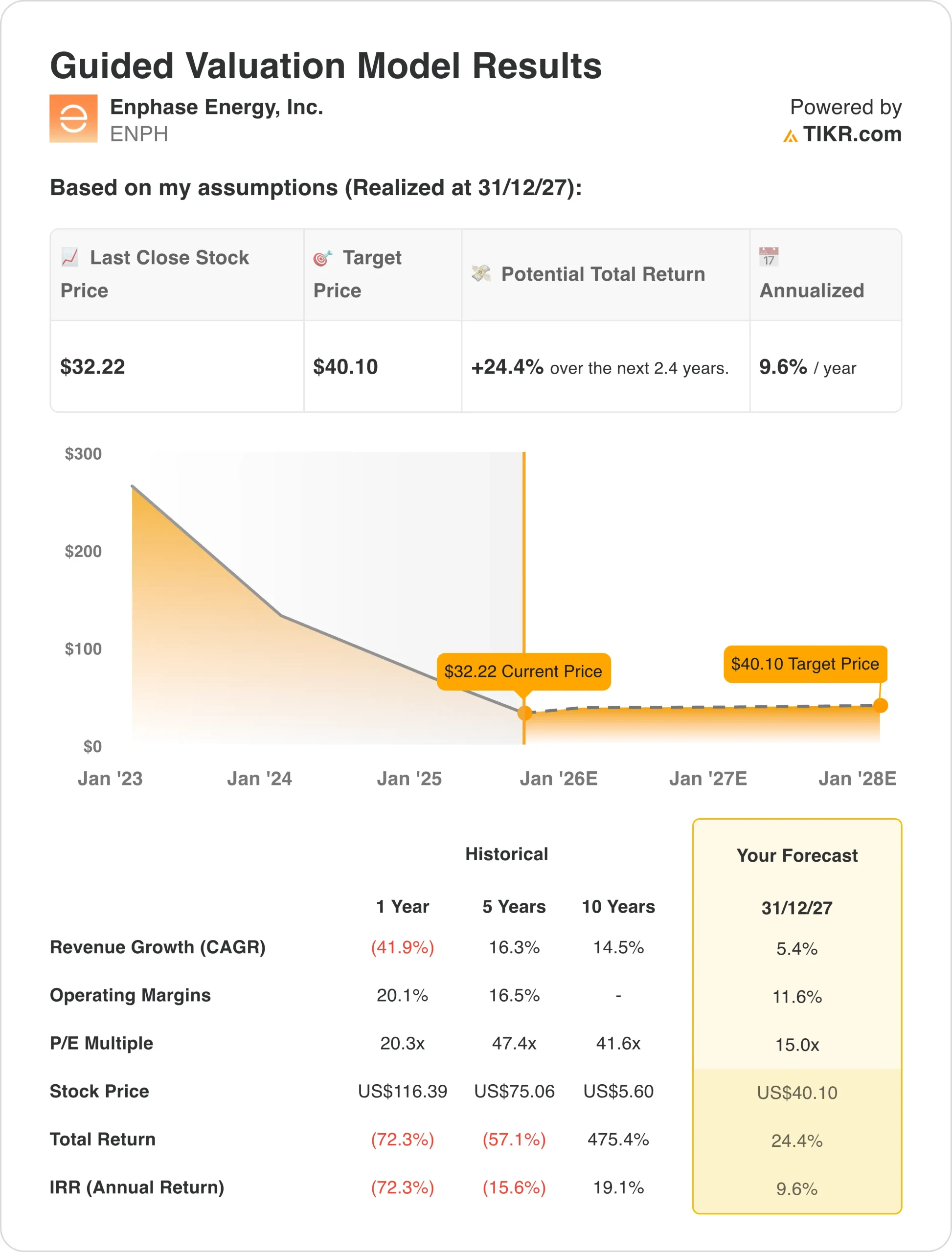 Based on estimates of 5.4% annual revenue growth, 11.6% operating margins, and a normalized P/E valuation multiple of 15.0x, the model projects ENPH stock could rise from $32/share to $40/share.