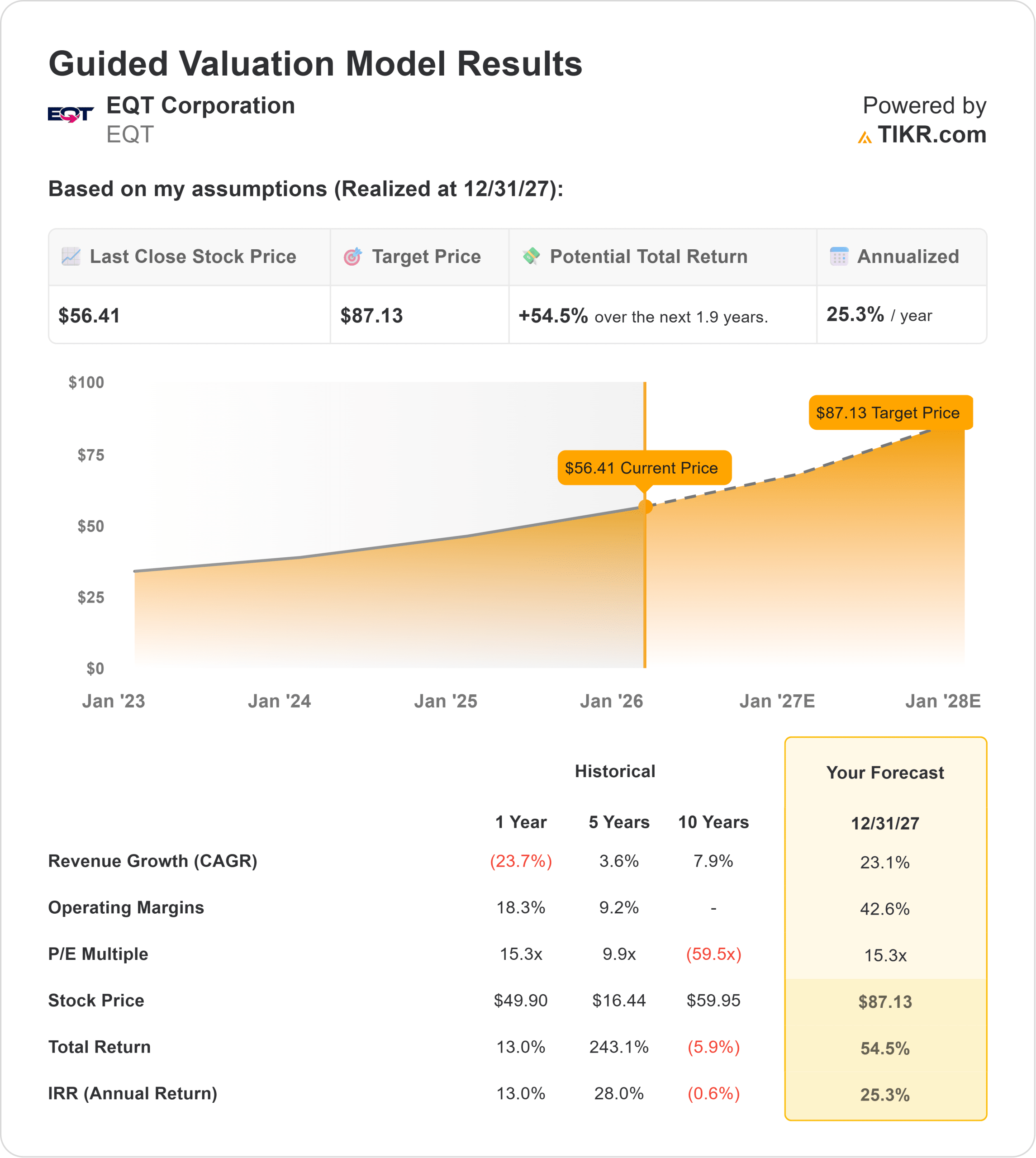 Using mid-case assumptions that price in a recovery in gas markets, the model points to a target price of $87.13 (rounded to $87) by December 2027.