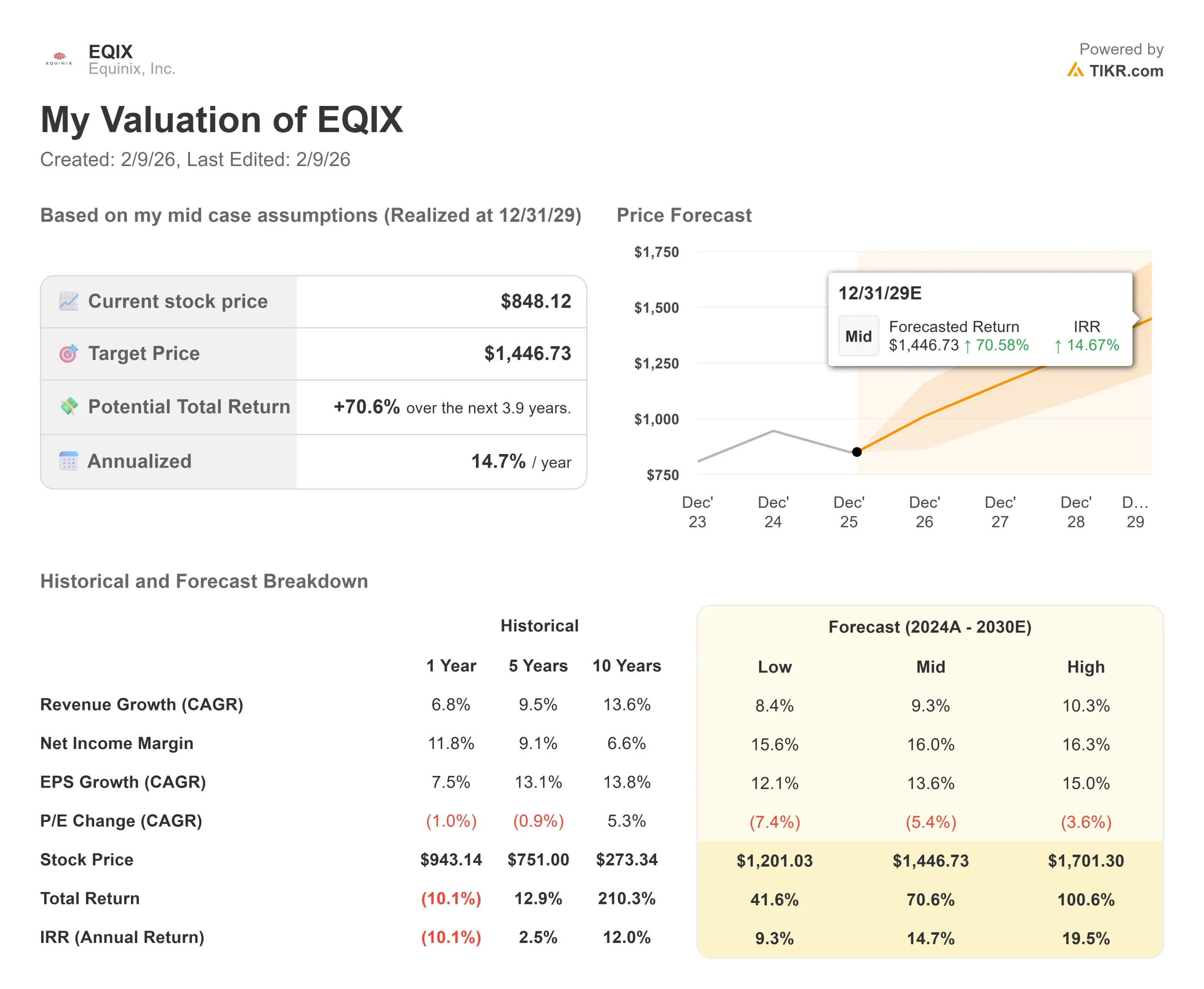 The TIKR Valuation Model suggests that if Equinix can capture its share of the AI boom, the stock is severely undervalued.