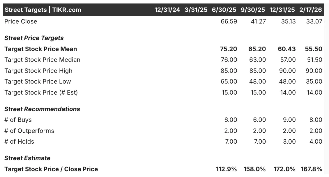 Street targets point to substantial potential upside from current levels. The average analyst target around $55–$56 per share implies about 68% upside from roughly $33, broadly in line with the Street‑targets table, which shows a mean target of $55.50 and a target‑price‑to‑close ratio of about 168%.