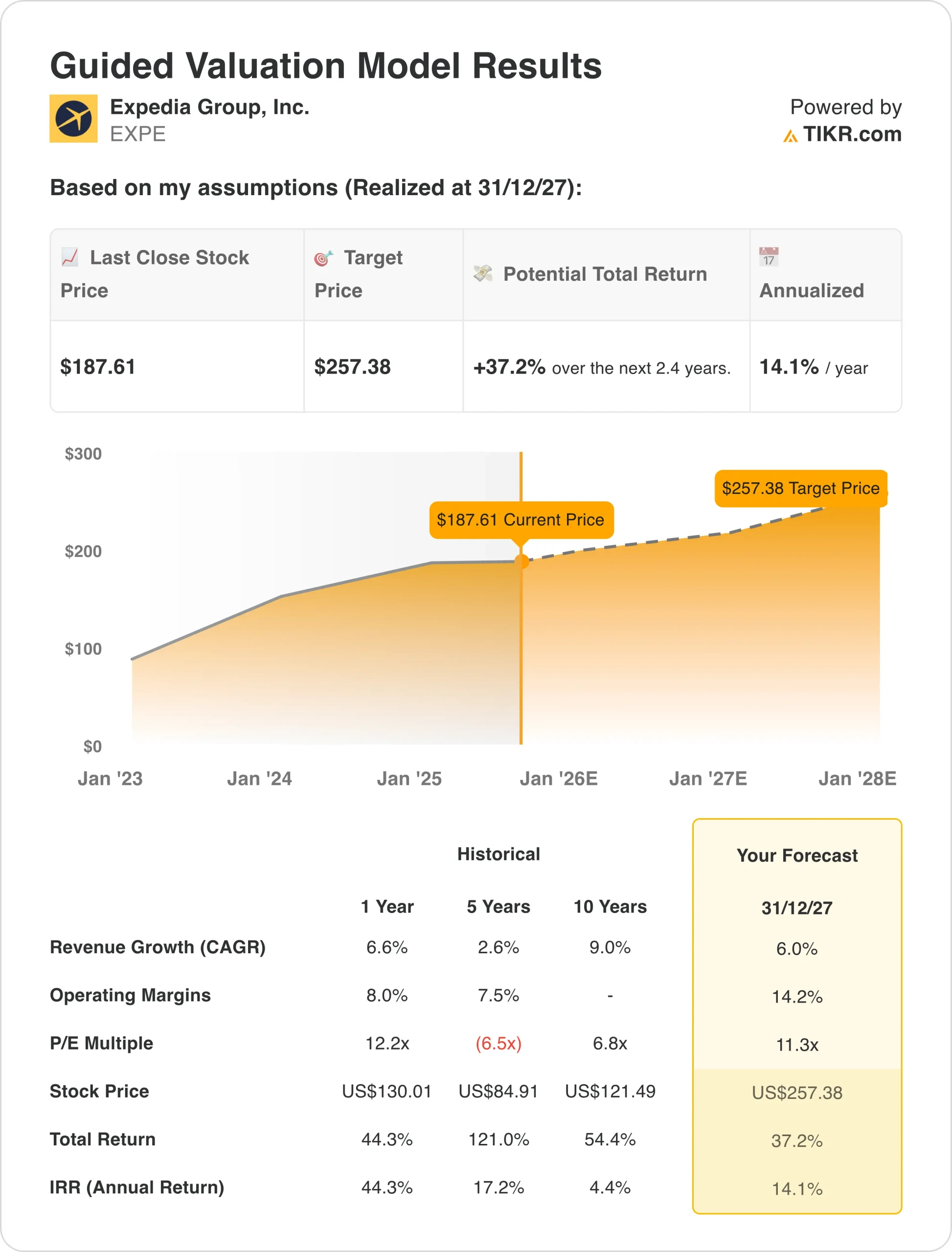 Based on estimates of 6.0% annual revenue growth, 14.2% operating margins, and normalized valuation multiples, the model projects EXPE stock could rise from $188/share to $257/share.