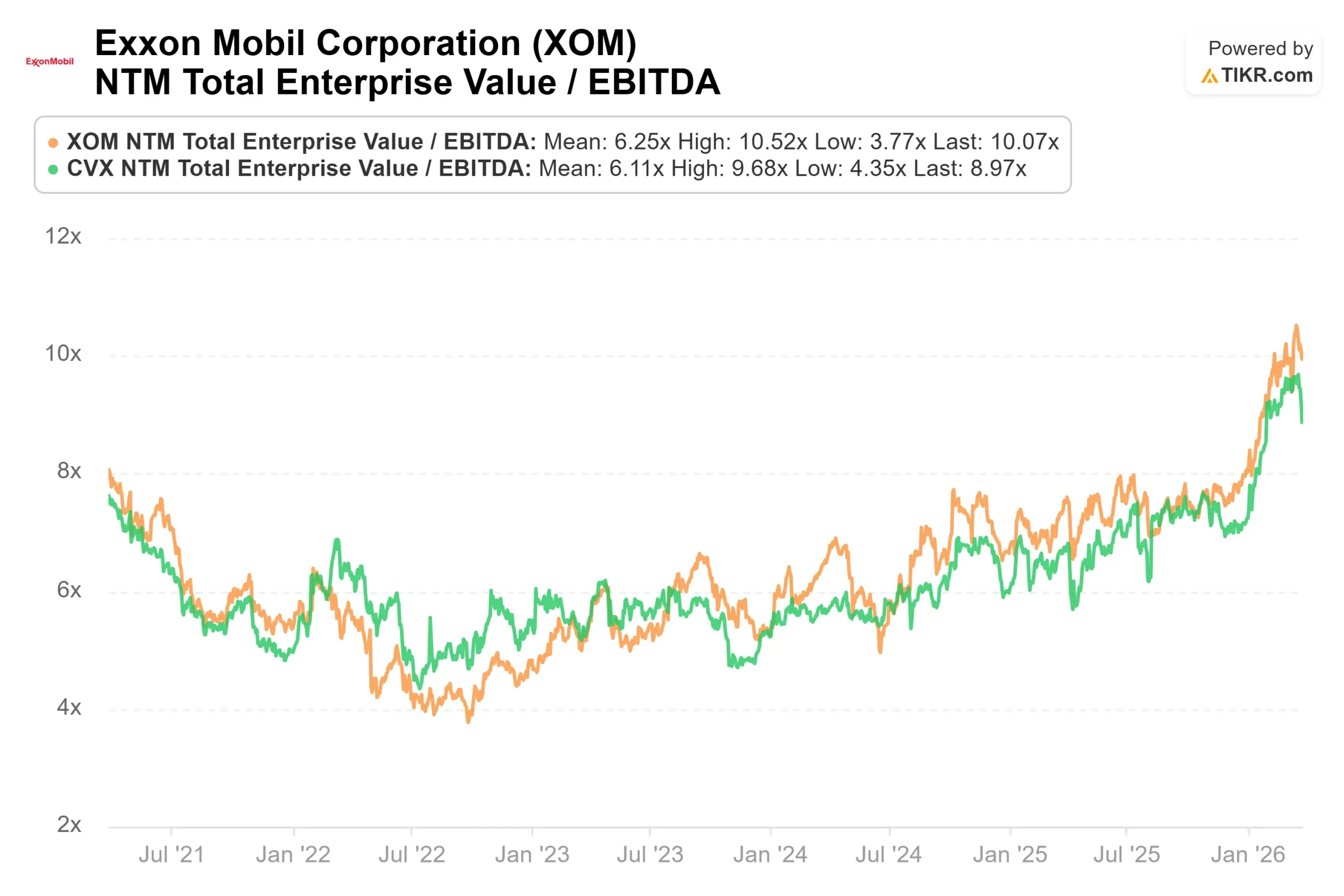 According to standalone valuation data extracted from TIKR, XOM currently trades at a 10.39x NTM EV/EBITDA multiple.
