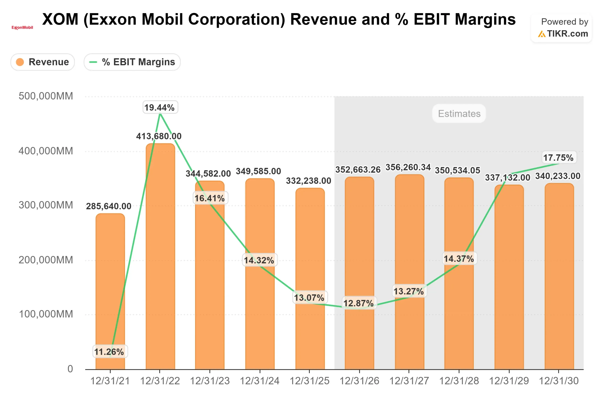 Conversely, the bottom line remains robust. The TIKR data confirms a strong 9.6% Historical 1-Year Net Income Margin. Maintaining or exceeding this profitability metric requires Exxon to successfully execute its $20 billion cost-reduction program and scale its high-margin Product Solutions (like Proxxima).