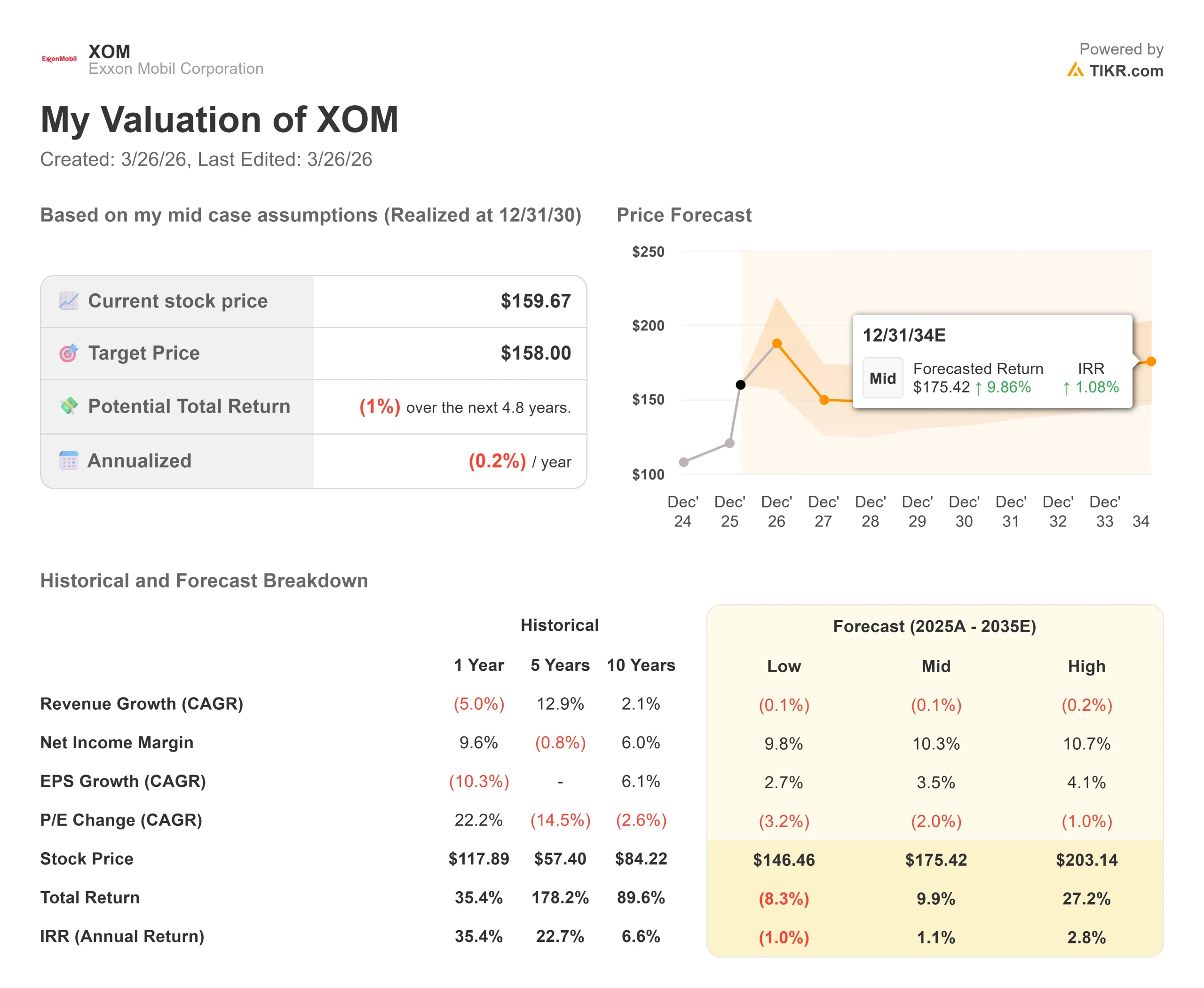 Conclusion: Exxon is executing flawlessly on a global scale. The company has fortified its dividend, growing it for 43 consecutive years, while funding massive growth in Guyana and the Permian without compromising its balance sheet. However, at $159.67, the market has already awarded it the crown. For investors, it remains a supreme dividend payer and an essential hedge against Middle East volatility, but the $158.00 TIKR target suggests outsized capital appreciation may be capped in the medium term.