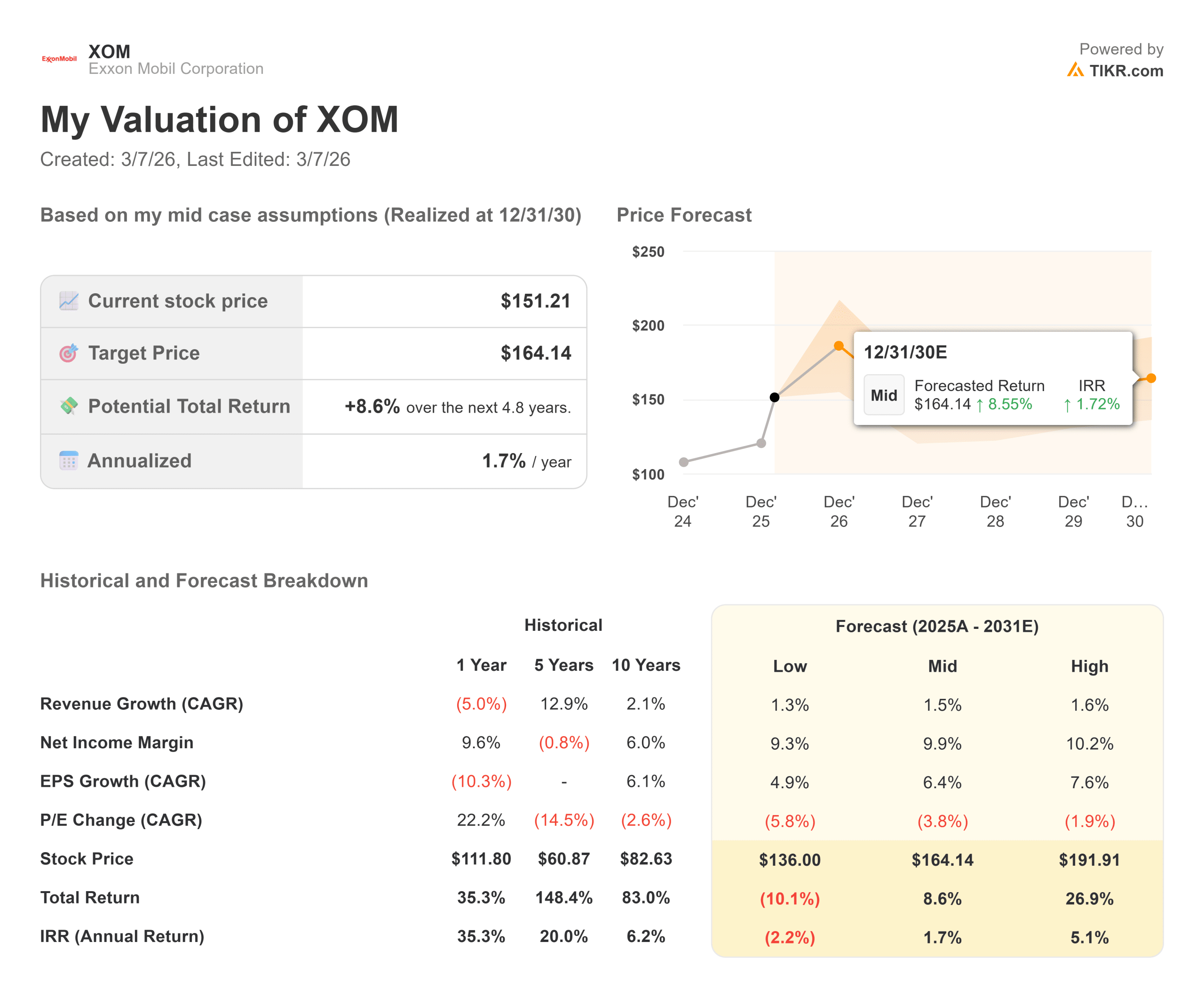 The “High-Floor” Margin Lever: While an 8.6% fundamental return and a 1.7% annualized IRR might seem modest compared to hyper-growth tech stocks, it represents an incredibly resilient “floor” for investors. The mechanical path to the $164.14 TIKR target is driven by extreme fundamental discipline. The model’s Mid Case assumes a highly respectable 12.9% Revenue CAGR over the next 5 years, acknowledging the aggressive production ramp in the Permian and Guyana. The true strength, however, comes from the company’s ability to maintain a rock-solid 9.6% Net Income Margin through 2030 despite commodity cycles, driven directly by the $20 billion in structural cost reductions.