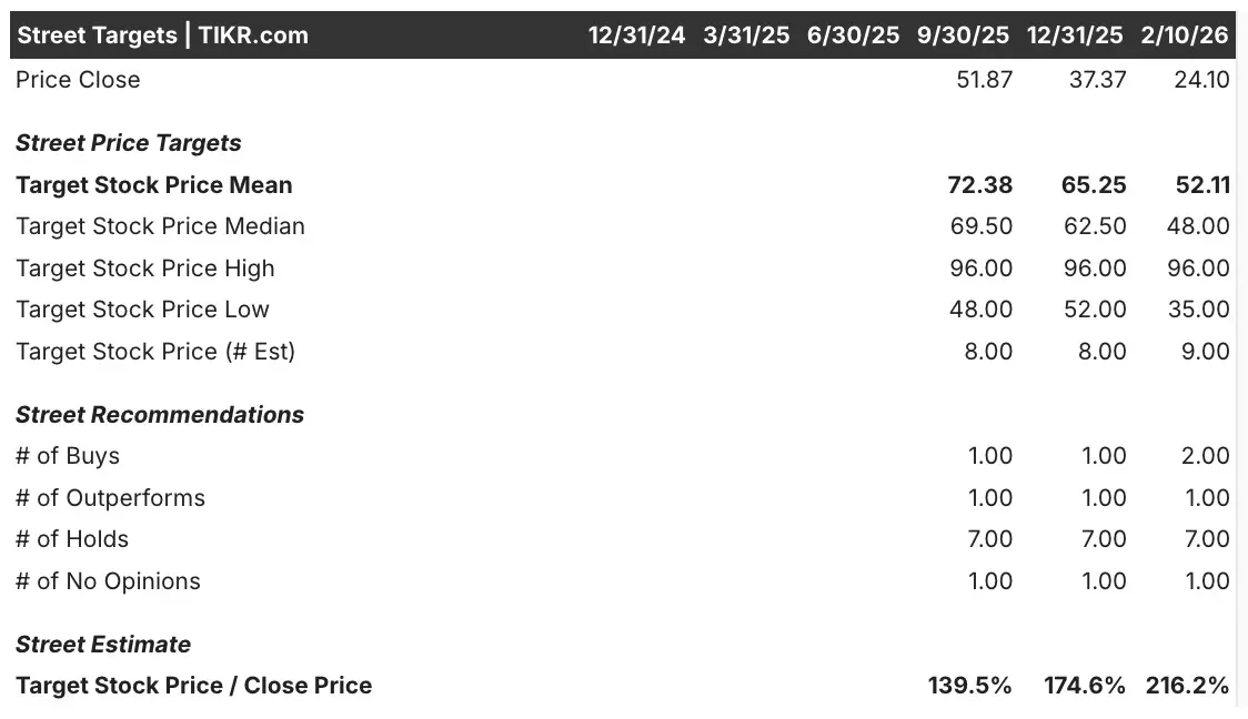 Price targets range from $35 on the low end to $96 on the high end, reflecting uncertainty around the pace of margin improvement rather than demand strength.