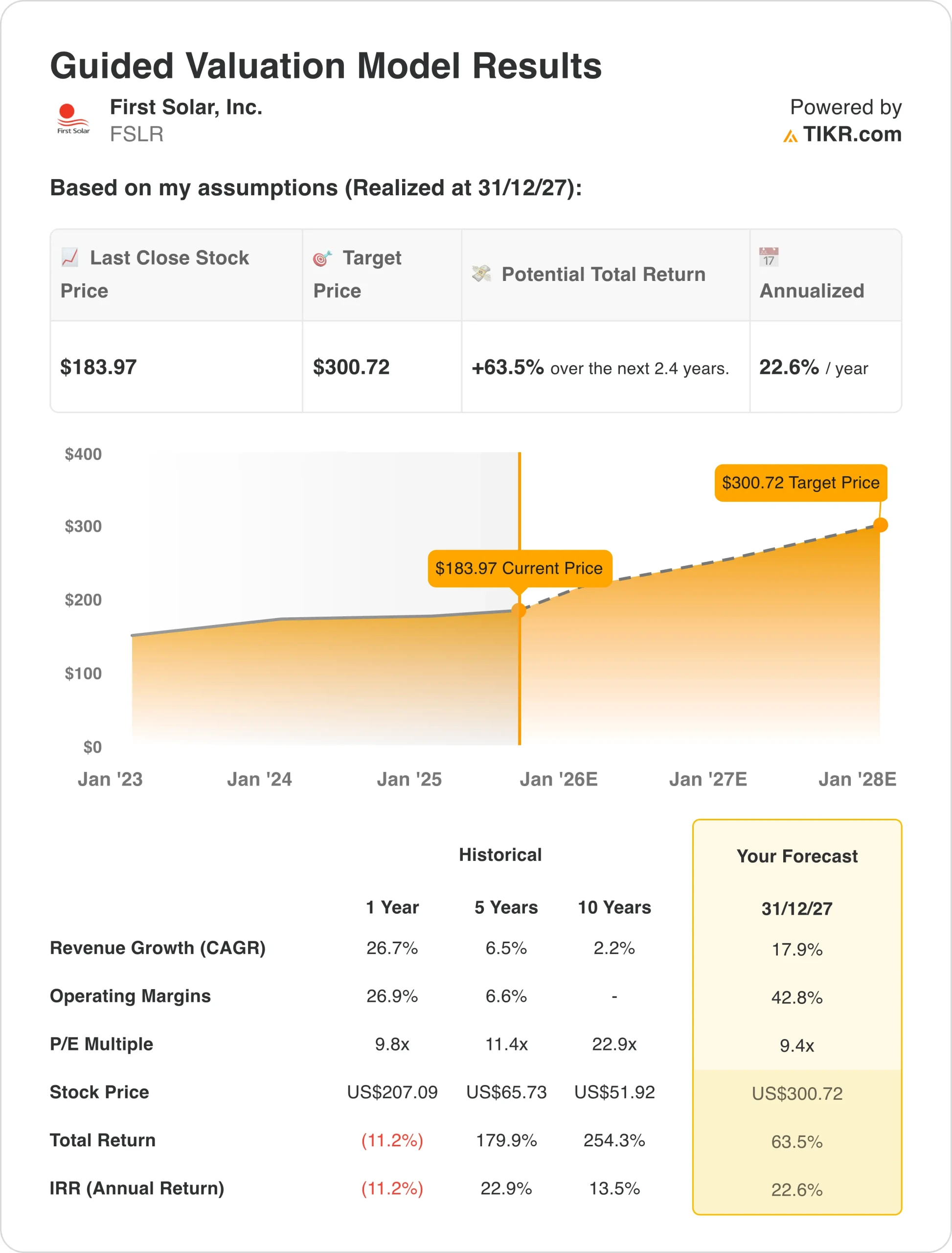 Analysts remain bullish on FSLR stock, with 30 out of 36 analysts recommending it as a buy. Our Valuation Model, based on analysts’ consensus estimates, suggests that First Solar could have a 64% upside today, which would translate to 23% annualized returns over the next 2.4 years.