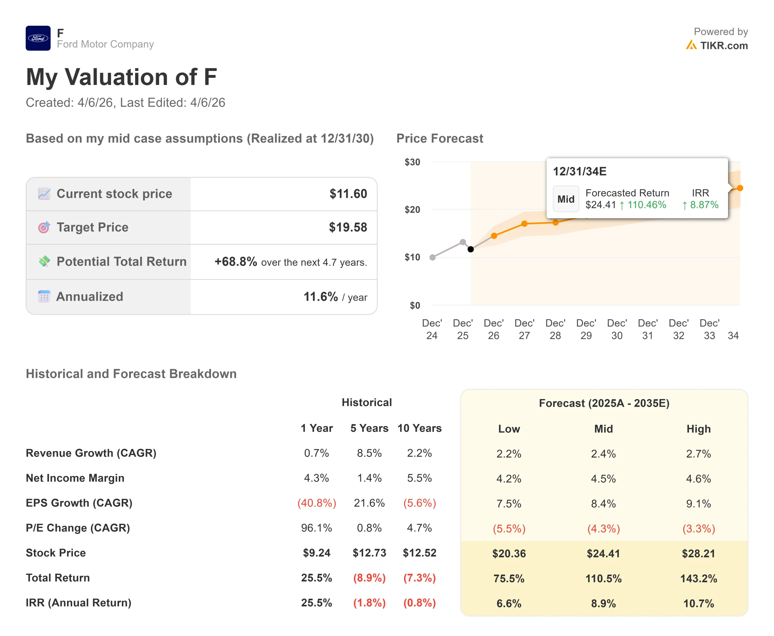Ford at $11.60 is a cash-generating business paying a 5.2% dividend while absorbing an EV transition with a defined endpoint. The TIKR mid-case implies 68.8% total return to 12/31/30 at an 8.90% annualized IRR. How much of that the tariff environment allows to materialize is the only question that matters at Q1 earnings.