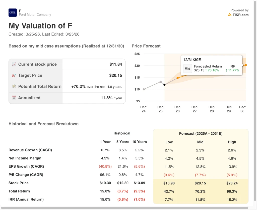 - Mid Case: Ford Pro stays strong, margins recover gradually, and the business delivers steadier earnings growth → 11.8% annual returns