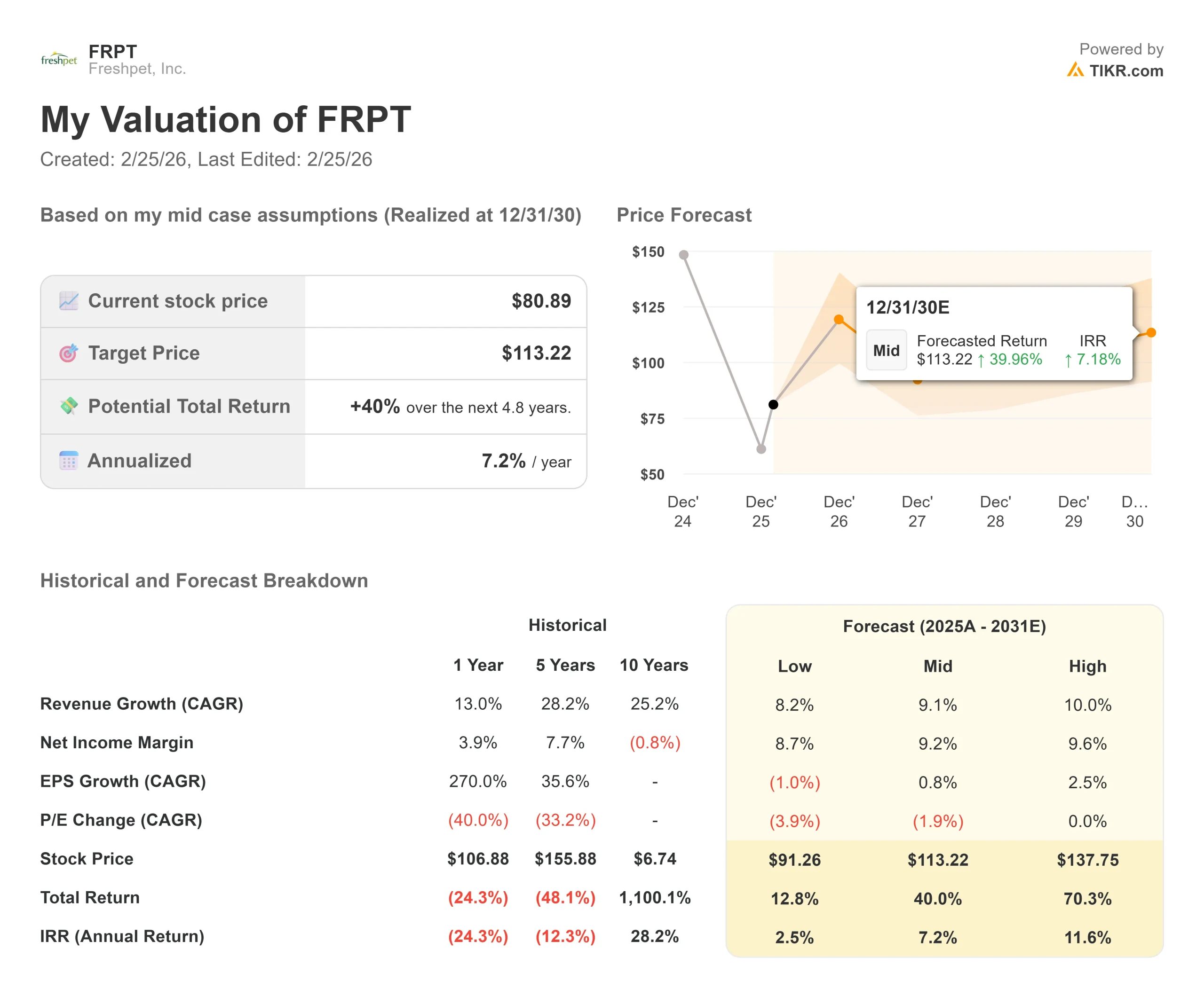 The TIKR Advanced Valuation Model identifies Freshpet as a dominant category leader that has successfully transitioned into a highly profitable, cash-generating enterprise.