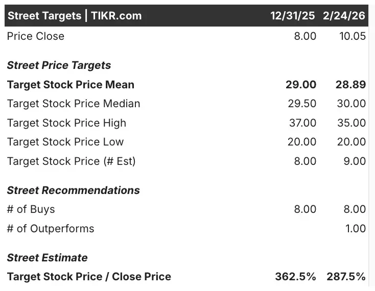 Analysts currently assign a mean price target of $29. That reflects expectations tied to project development rather than current cash flows.