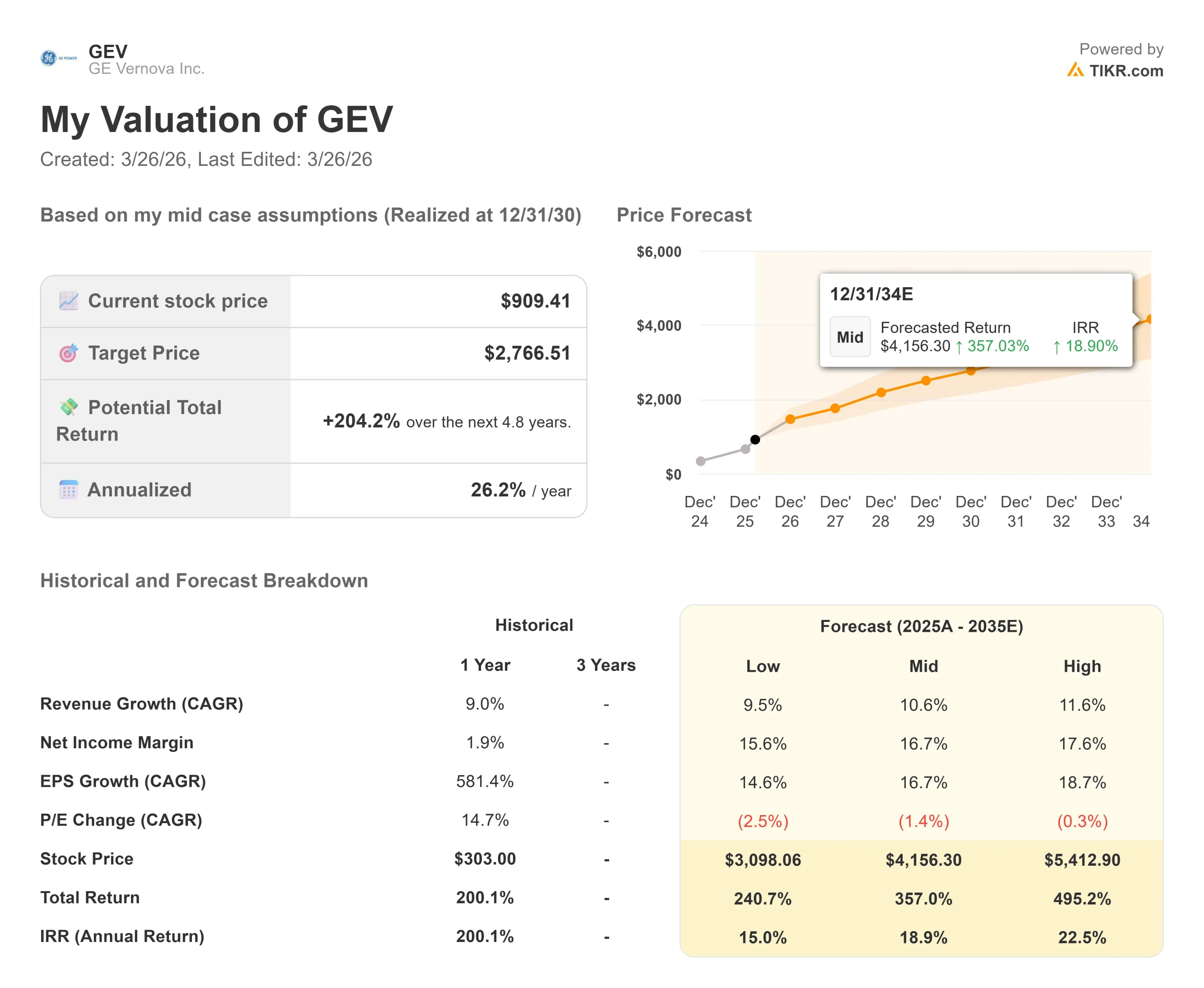 GE Vernova is not a cheap stock. It is the dominant incumbent in an oligopolistic market where every new heavy-duty gas turbine project requires either GEV’s or Siemens Energy’s equipment, and GEV is sold out through 2028. At the model entry price of $909.41, the market has priced in much of that reality. The TIKR mid-case model suggests it has not priced in all of it.