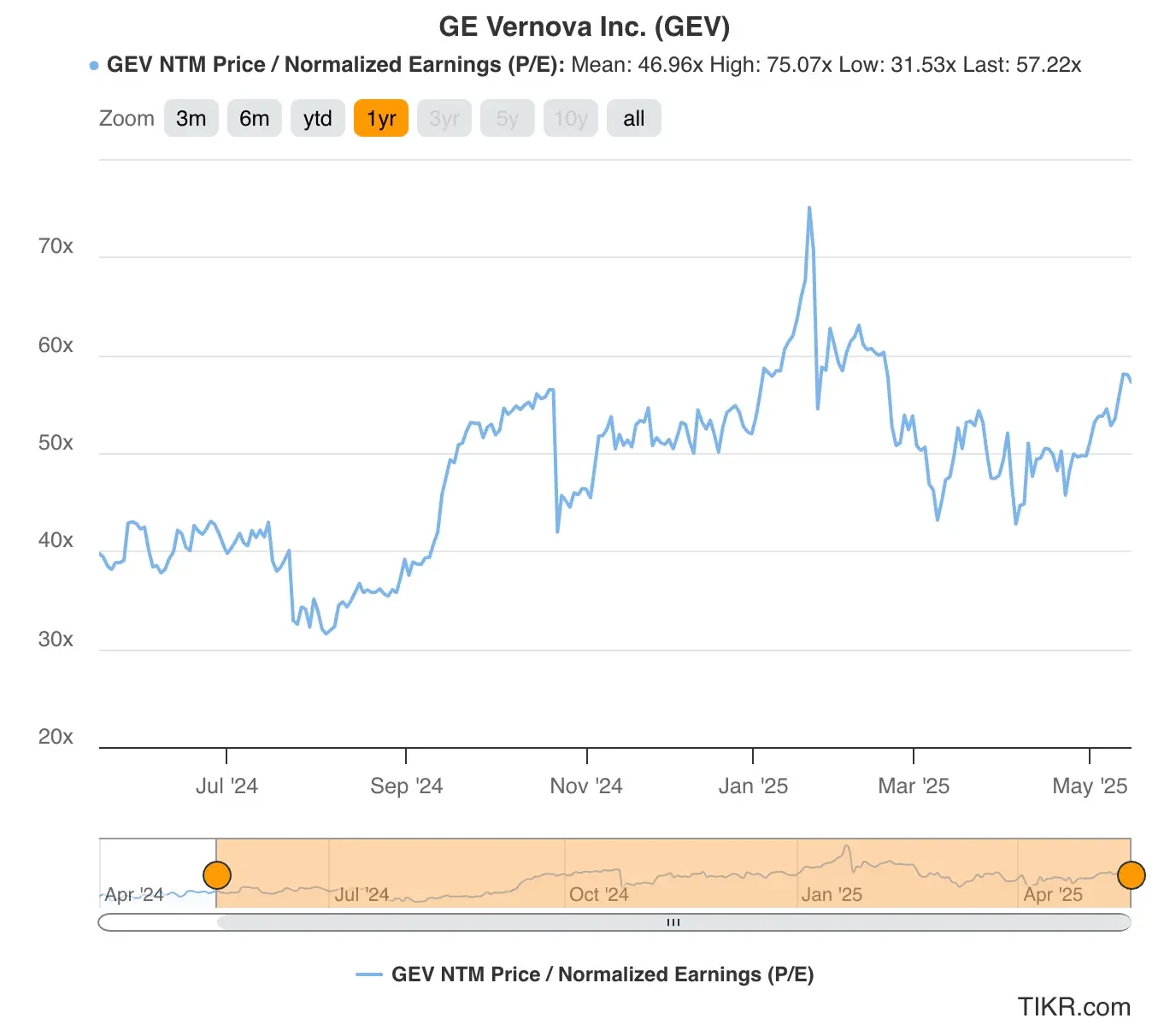 GEV stock currently trades at around 57x forward earnings, above its 12-month historical average of 47x, as shown in the P/E chart.