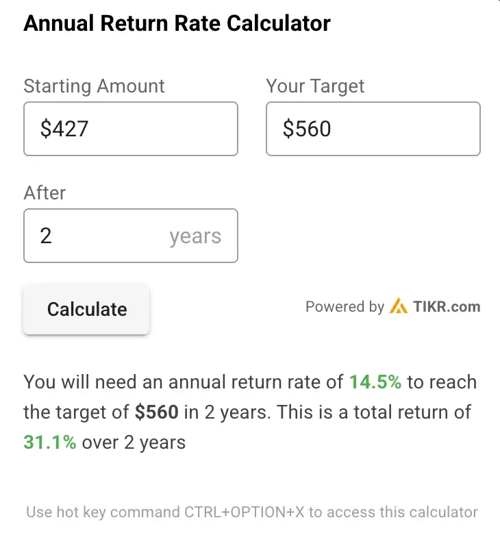 Expected Normalized EPS ($14) * Forward P/E ratio (40x) = Expected Share Price ($560)
