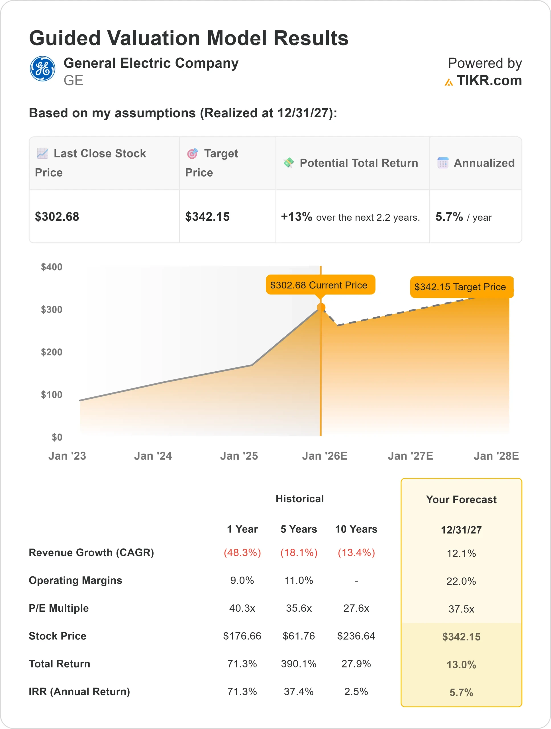 Based on analysts’ average estimates, TIKR’s Guided Valuation Model using a 37× forward P/E suggests GE could trade near $342/share by 2027, implying about 13% total upside or roughly 5.7% annualized returns.