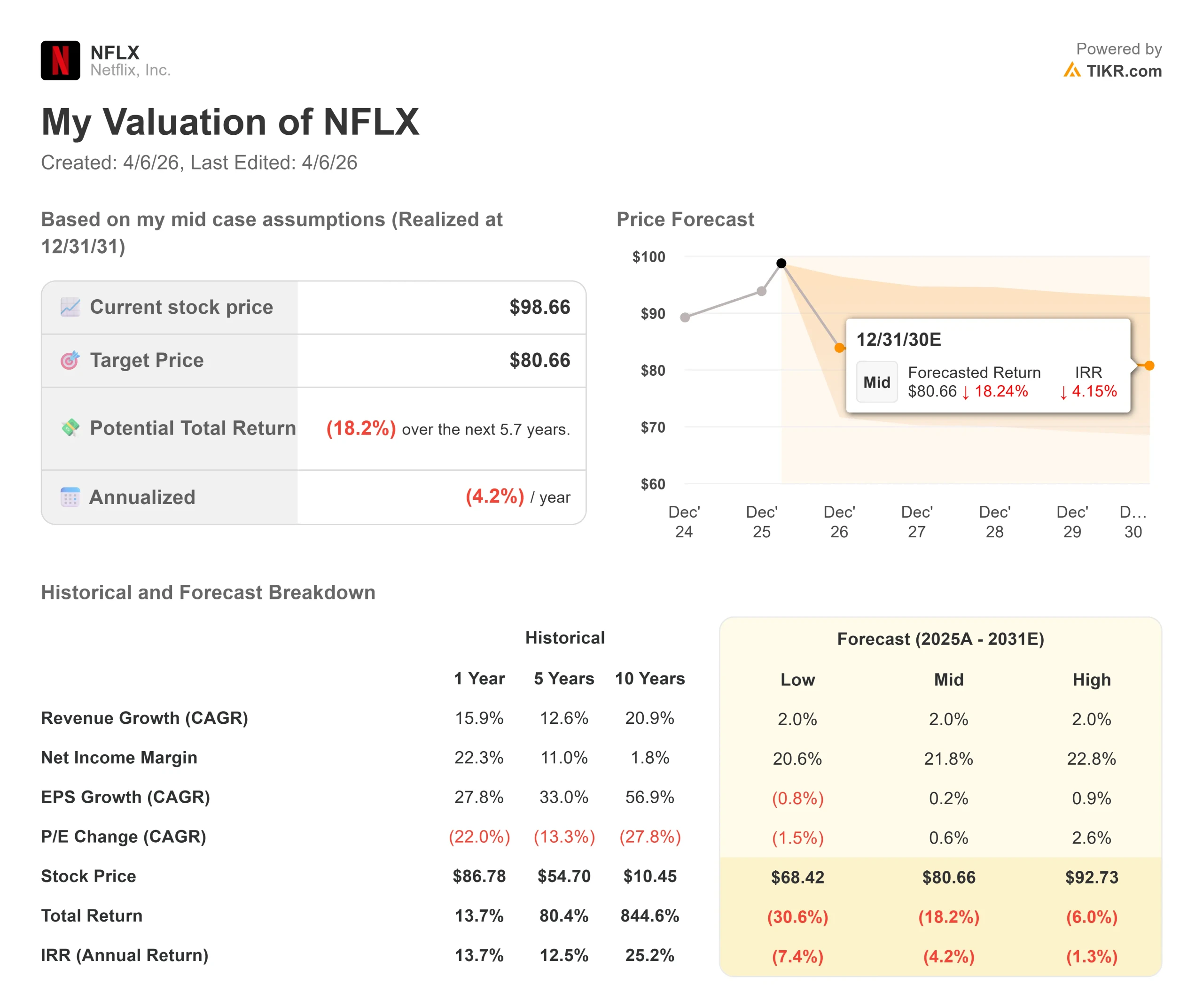 From there, TIKR calculates the potential share price and total returns under Bull, Base, and Bear scenarios so you can quickly see whether a stock looks undervalued or overvalued.