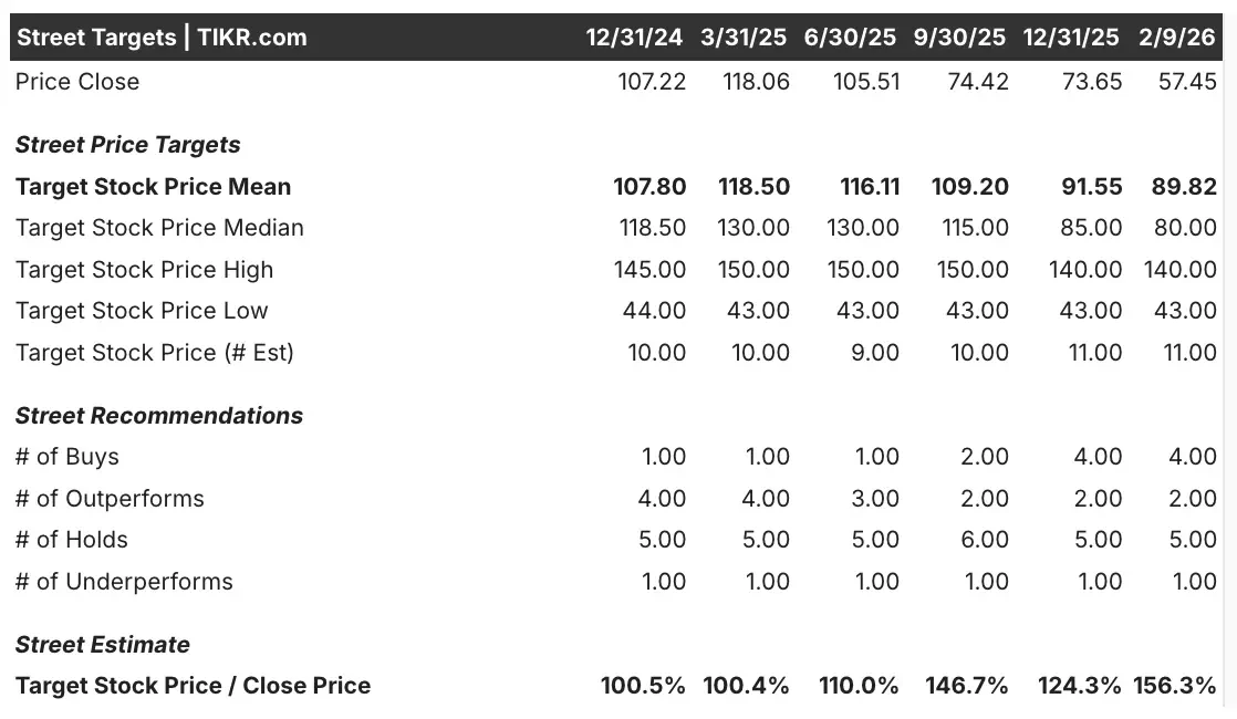 Over the past year, the stock reached a high near $127.99 before giving back most of those gains. Street Targets data shows the average analyst price target has come down significantly, from above $109 at the end of 2025 to $89.82 most recently, signaling recalibration among analysts alongside the stock’s weakening price action.