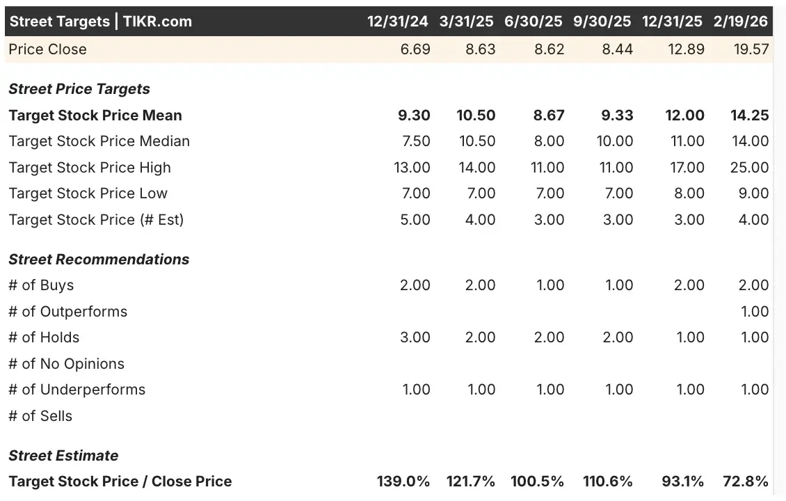Street estimates range from $9 on the low end to $25 on the high end. The wide dispersion reflects uncertainty around long-term growth and leverage.