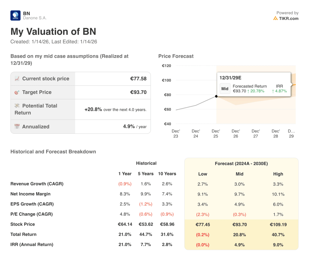 We analyzed the potential return profile for Danone stock using valuation assumptions grounded in its recent revenue trends, profitability trajectory, and current market valuation multiples. The model incorporates Danone’s focus on improving operating efficiency, managing input‑cost inflation, and maintaining a balanced capital allocation policy with dividends and buybacks while continuing to invest in growth categories.