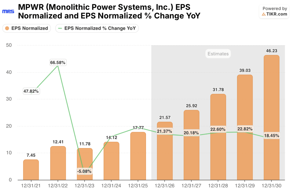 MPWR’s normalized EPS is expected to reach $21.57 in 2026 and $25.92 in 2027, growth of 21.4% and 20.2% respectively, anchored by the same Enterprise Data bookings acceleration that pushed management to raise the growth floor from 30%–40% to at least 50% for the current fiscal year.