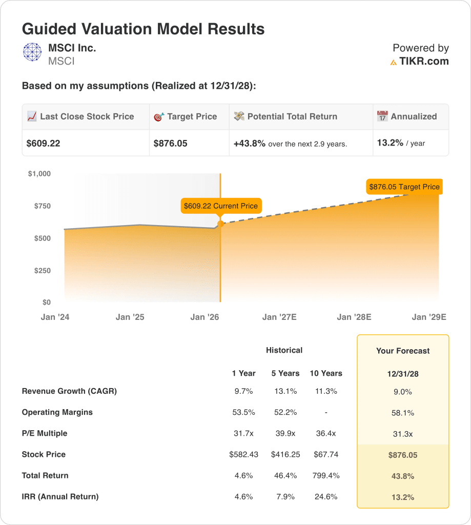 Under these inputs, MSCI stock reaches $876, implying 44 total upside and 13 annual return.