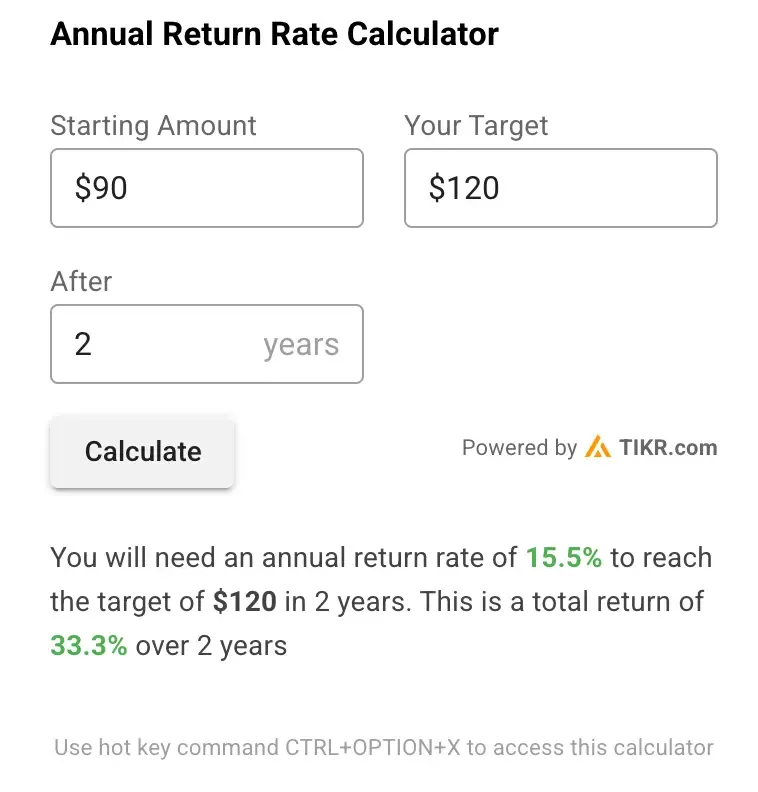 With Uber stock currently trading at around $120 per share, this implies a potential upside of 33% over the next two years or a 16% annualized return.