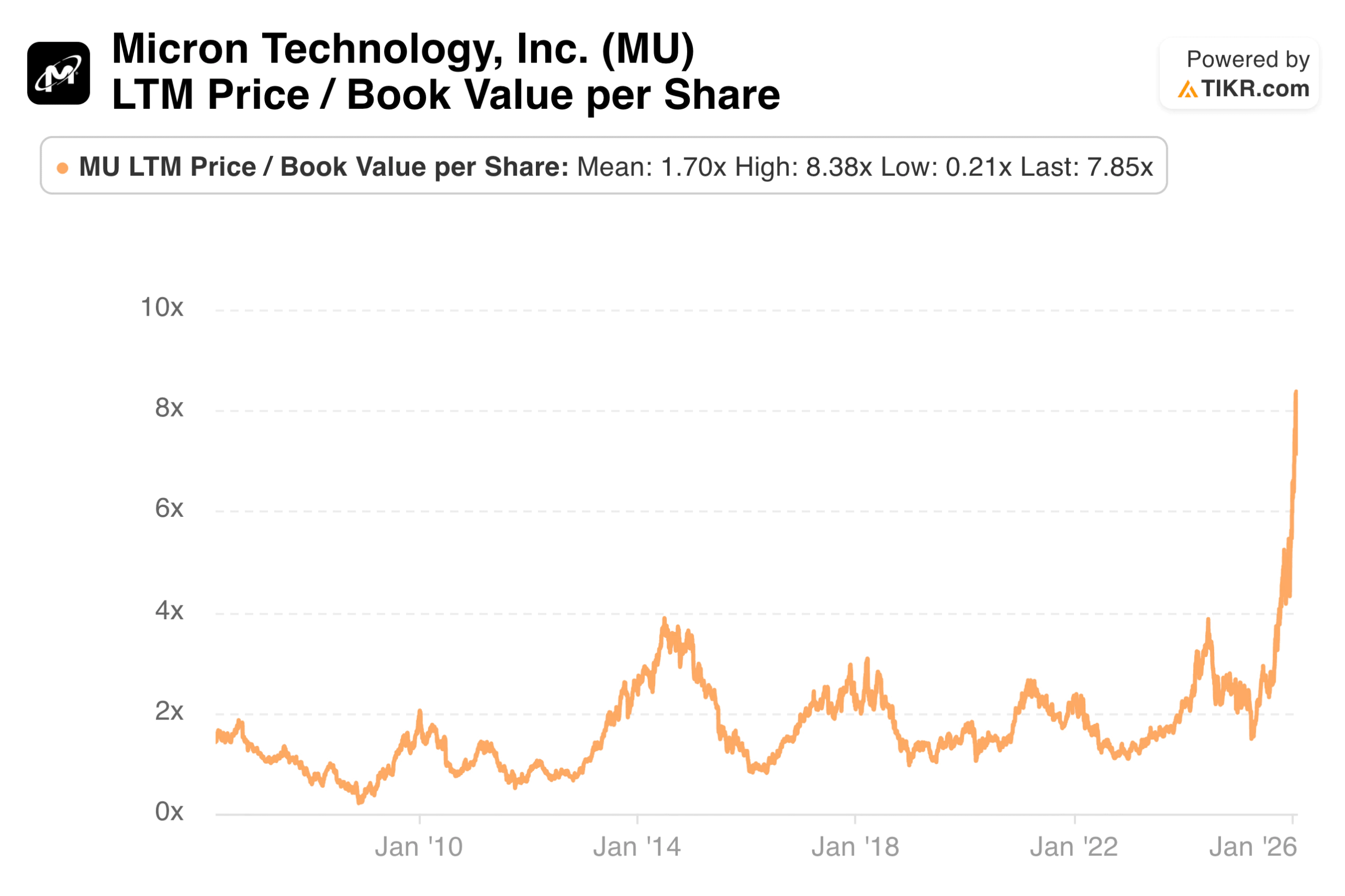 TIKR tip: Track price-to-book value over time in TIKR’s Valuation section to see how the current multiple compares to historical peaks and troughs. Cyclical companies often reach similar valuation extremes at each cycle turn, providing reference points for timing.