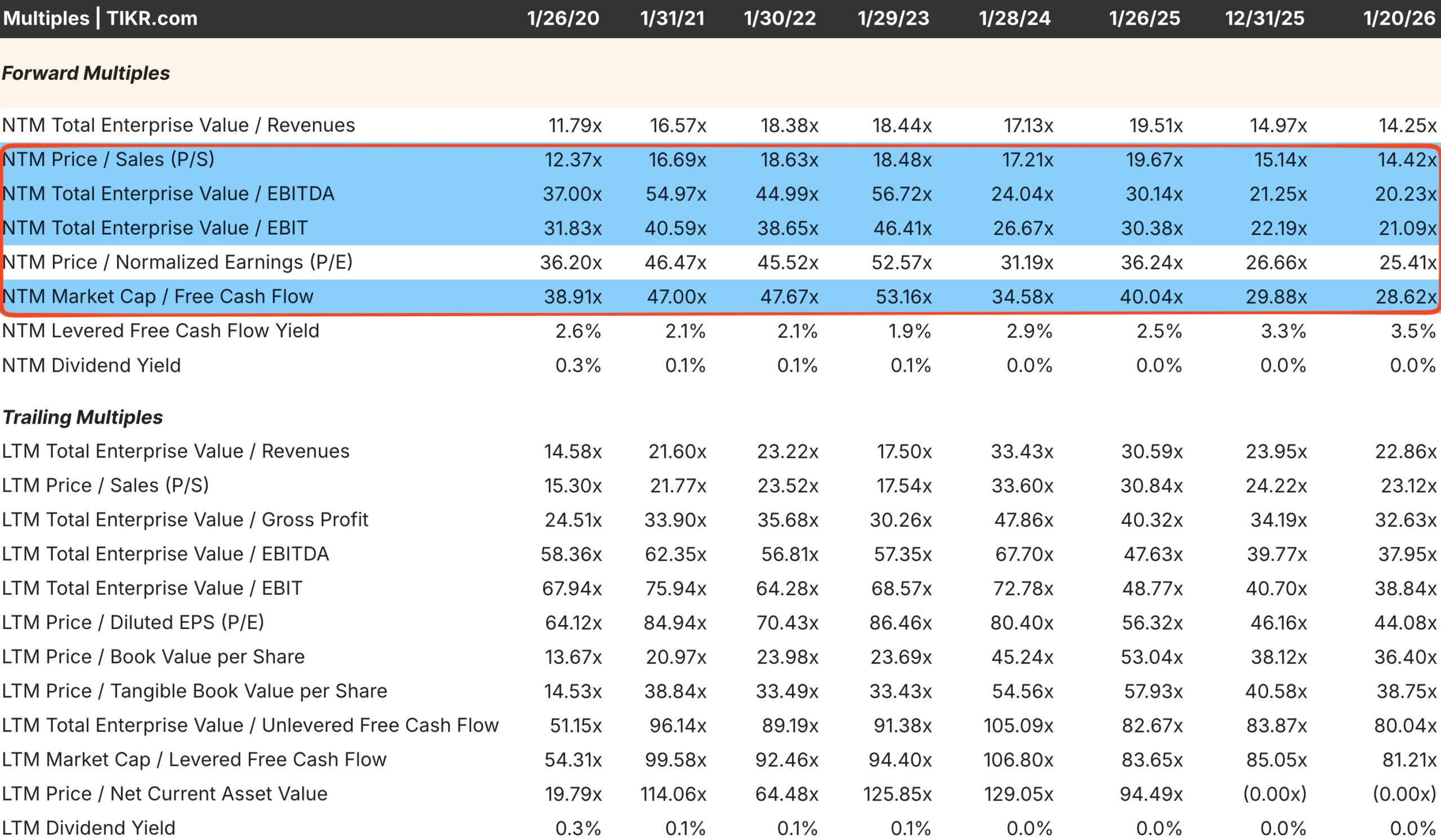 TIKR tip: TIKR displays a full range of valuation multiples in one view, including P/E, EV/EBITDA, EV/EBIT, P/S, and free cash flow yield. You can compare current multiples to five-year and ten-year averages to see whether the stock is trading above or below historical norms.