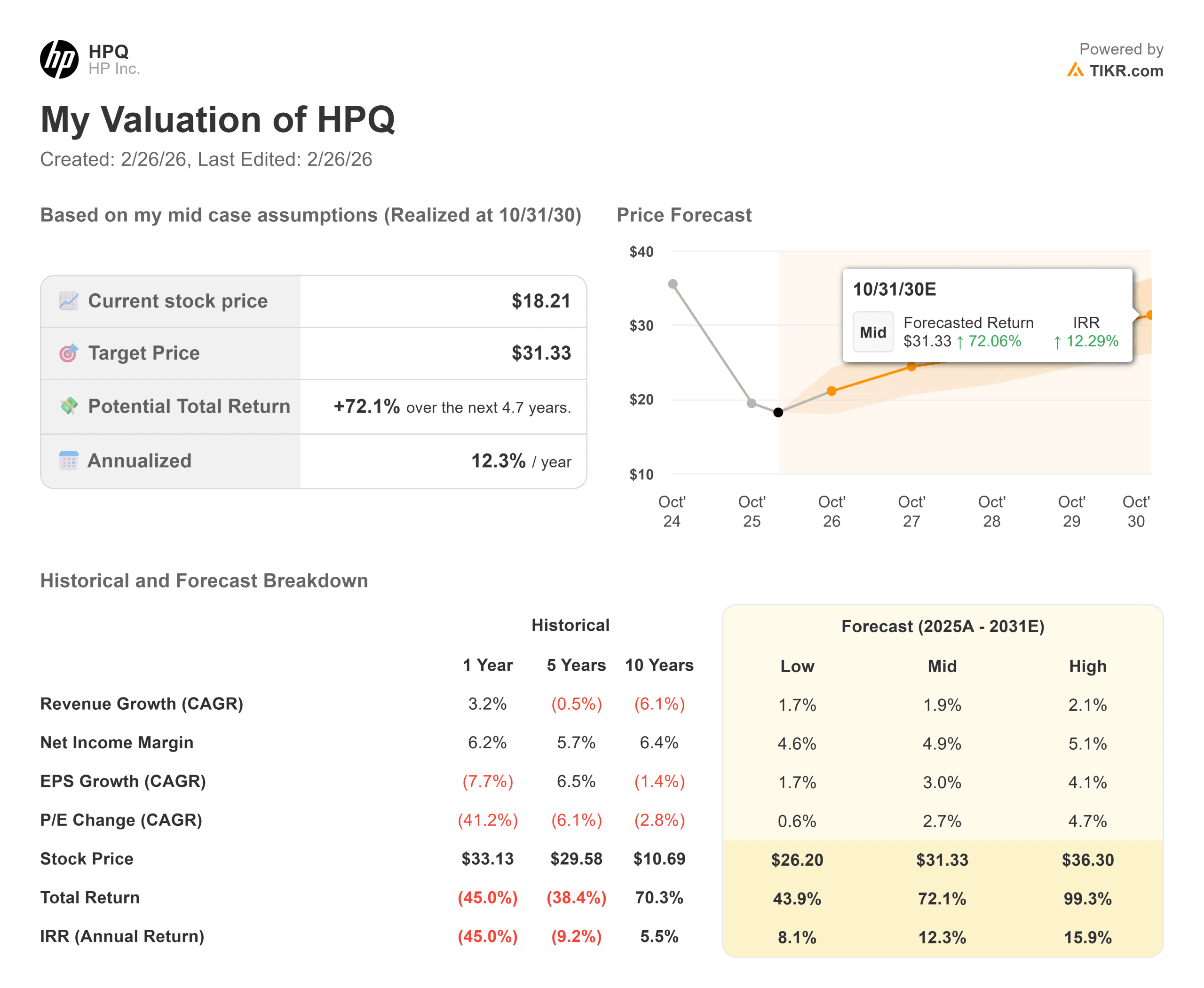 The TIKR Advanced Valuation Model identifies HP as a highly resilient cash generator capable of surviving brutal hardware cycles while aggressively buying back its own deeply discounted stock.