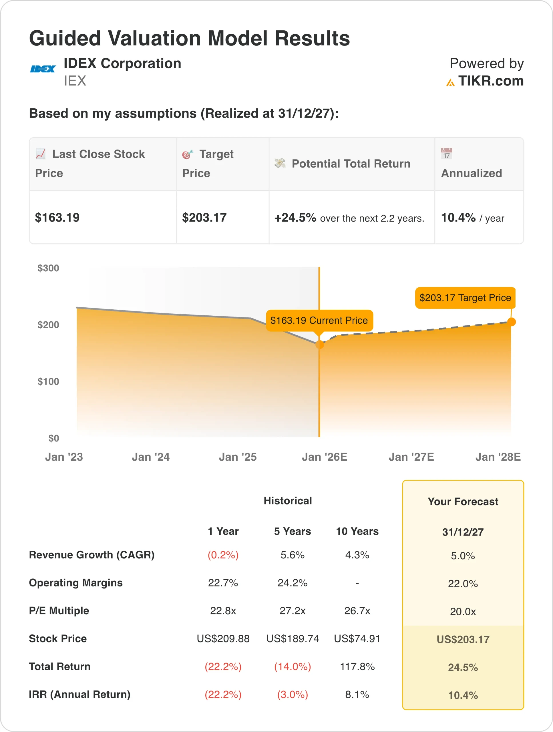 Based on estimates of 7.3% annual revenue growth (reflecting a conservative near-term outlook with back-half acceleration), 19.1% net margins, and a normalized P/E multiple of 20.0x, the model projects IDEX stock could rise from $163/share to $203/share.