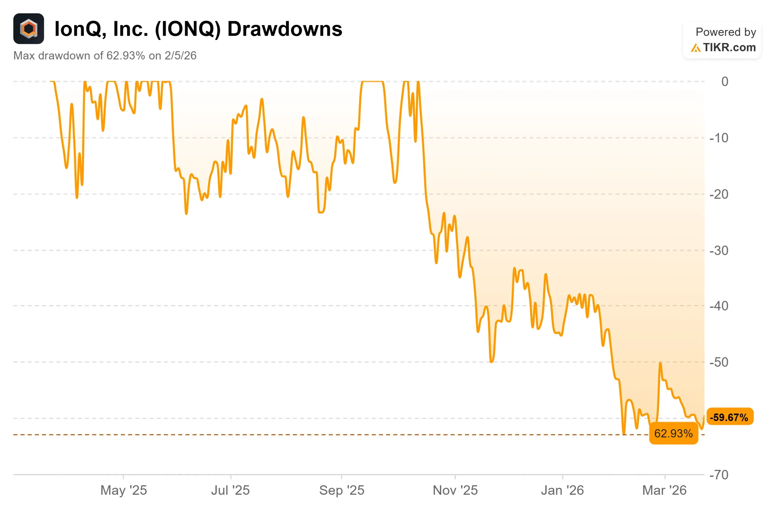 IonQ currently trades at $31.20, reflecting an extreme 62.93% max drawdown observed on February 5, 2026.