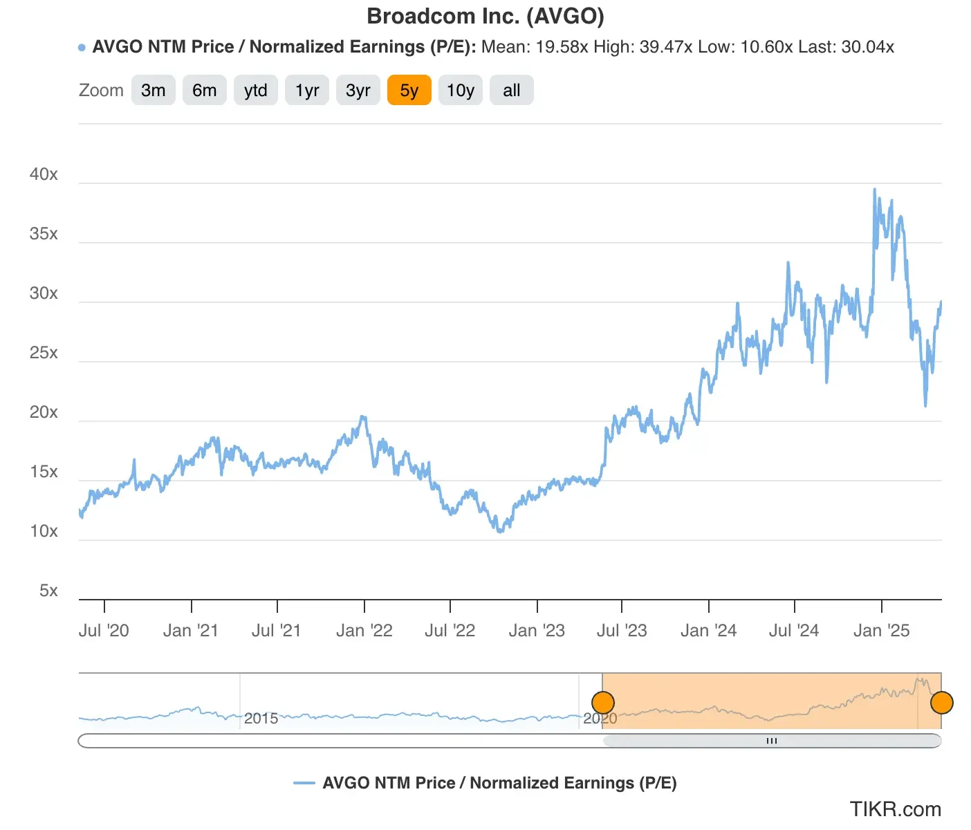Broadcom stock trades at around 30x forward earnings, which is a bit above its 5-year historical average P/E of 20x, as shown in the valuation chart.