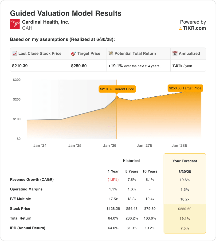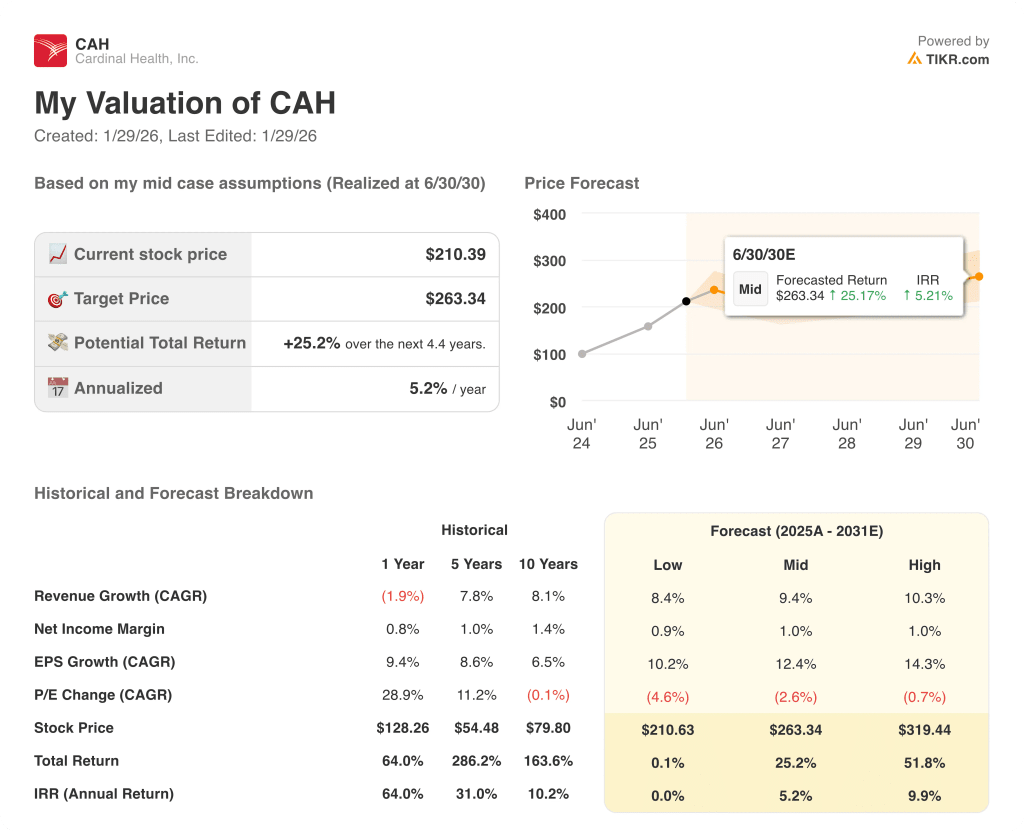 - Upside Math: Cardinal Health stock implies 19% total upside from the current $210 price, translating into roughly 7% annualized returns.