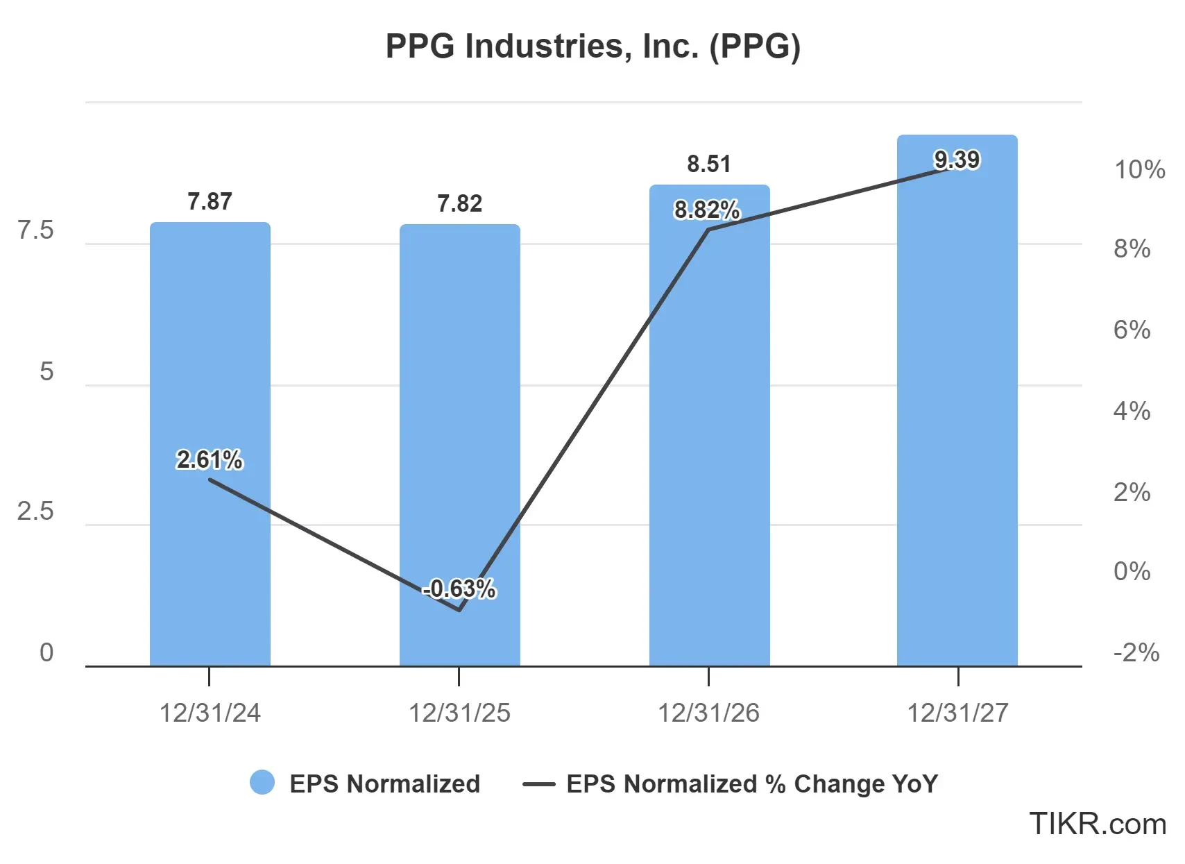 This trajectory suggests that after a period of earnings pressure, PPG is expected to return to growth in 2026, with momentum continuing thereafter. The initial negative growth reflects the challenging economic environment and cost pressures that have impacted the industrial sector broadly.