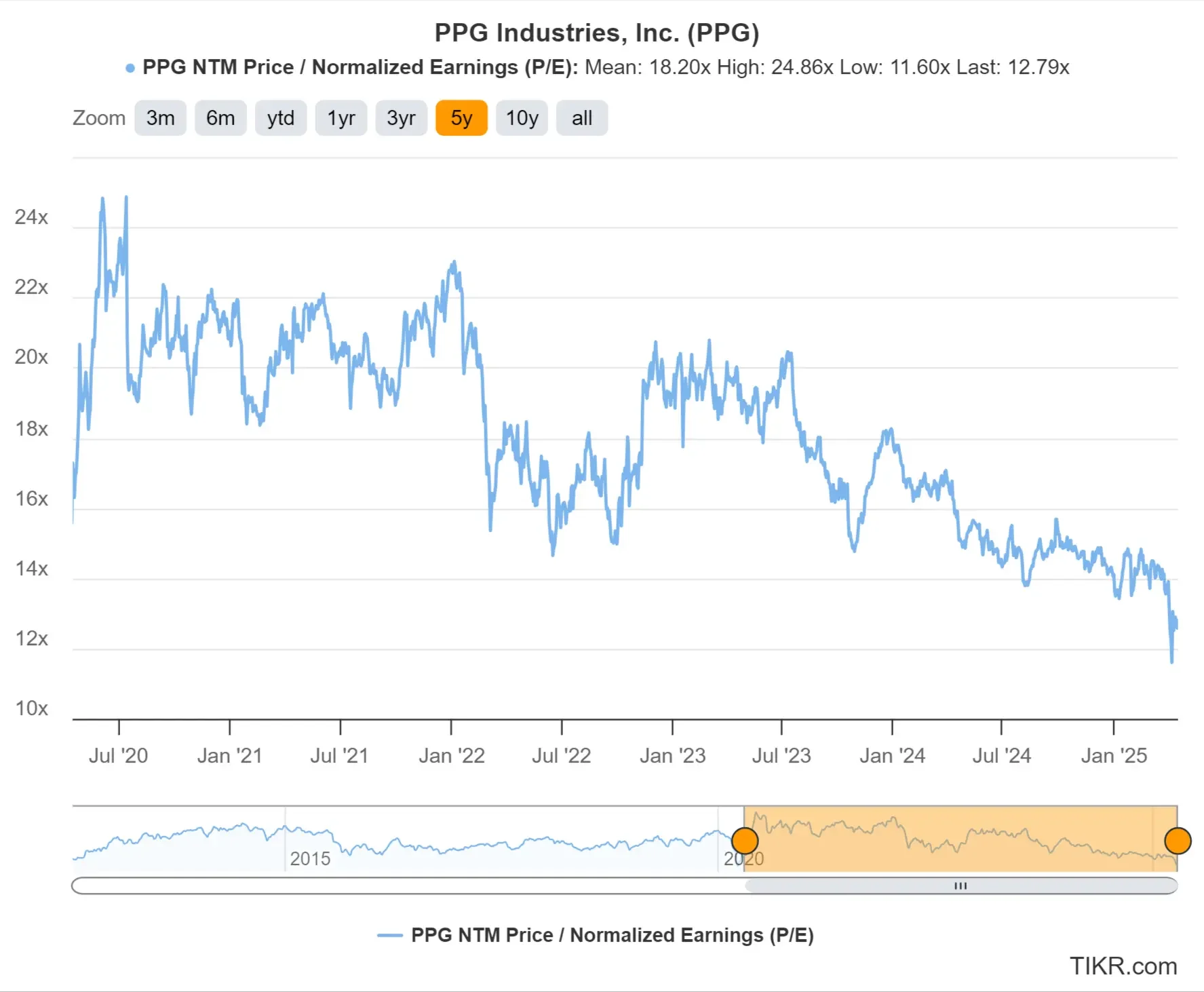 PPG stock has historically traded at an average forward P/E multiple of 18.2x, as shown in the historical P/E chart. The stock has traded as high as 24.9 times earnings and as low as 11.60 times earnings, with a current P/E ratio today of 12.8x.