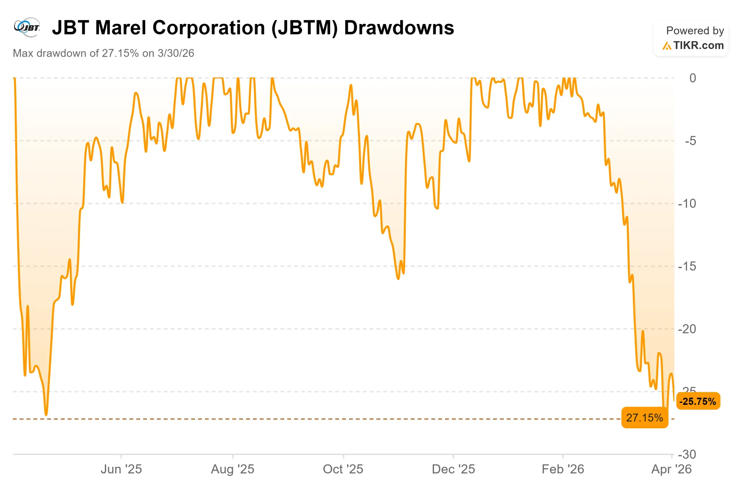 JBT Marel (JBTM) has lost 27.15% from its 52-week high of $170.19, touching a drawdown low on March 30, 2026, just four days after management held its 2026 Investor Day in New York.