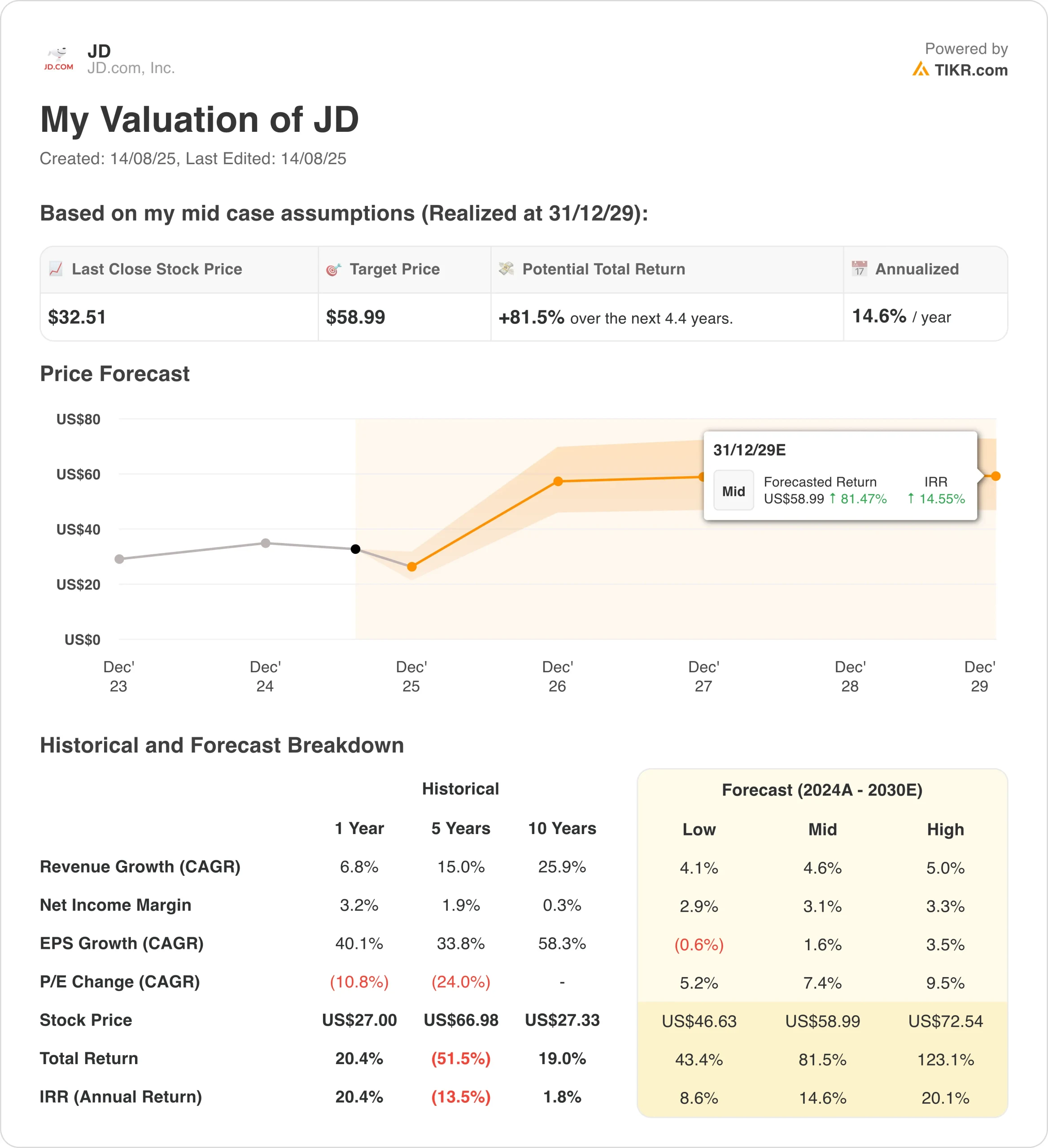 Based on estimates of 8% annual revenue growth, 3% operating margins, and a normalized P/E valuation multiple of 10.0x, the model projects JD stock could rise from $33/share to $49/share.