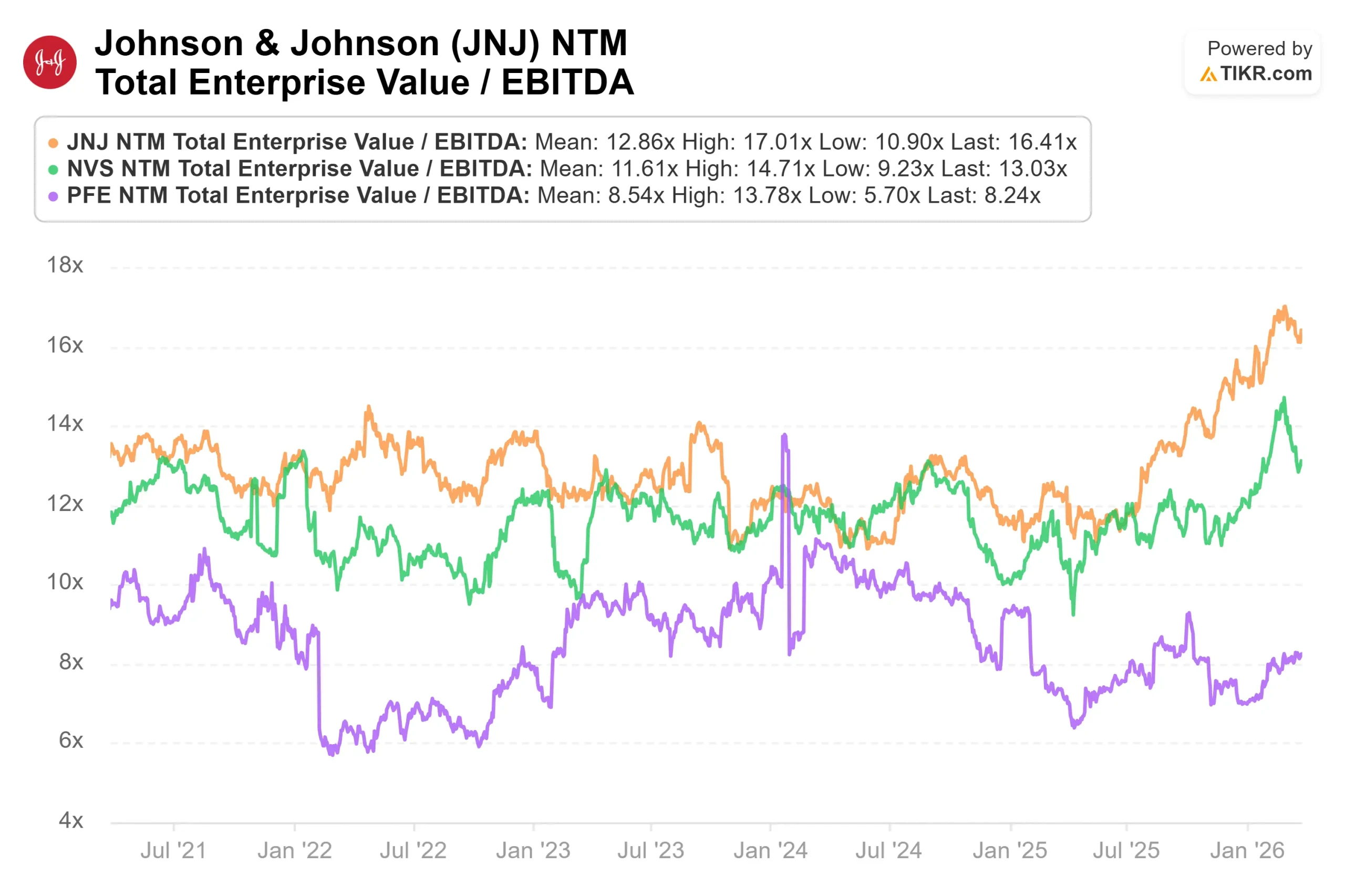 Evaluated on standalone valuation data from TIKR, JNJ currently trades at an NTM EV/EBITDA multiple of 16.10x and an NTM P/E of 20.79x.