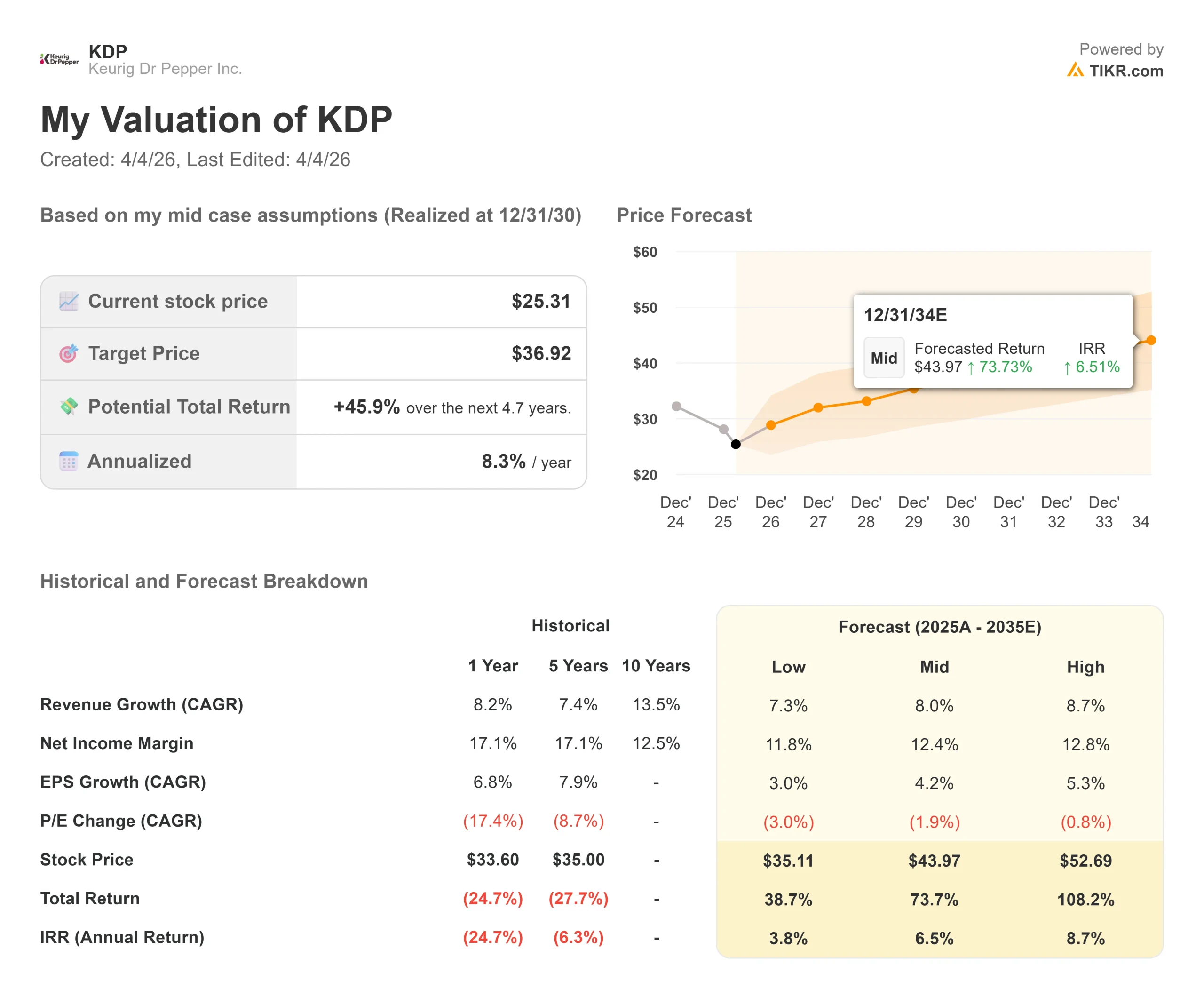 The TIKR mid-case model targets $36.92 by 12/31/30, using an 8.0% revenue CAGR driven by U.S. Refreshment Beverages growth and JDE Peet’s integration revenue. Net income margin is modeled at 12.4% in the mid case, with EPS growing at a 4.2% CAGR. The model actually assumes modest P/E contraction of (1.9%) per year, meaning the 45.9% return does not require a multiple re-rating, only earnings growth at a moderate pace while today’s discounted valuation holds.